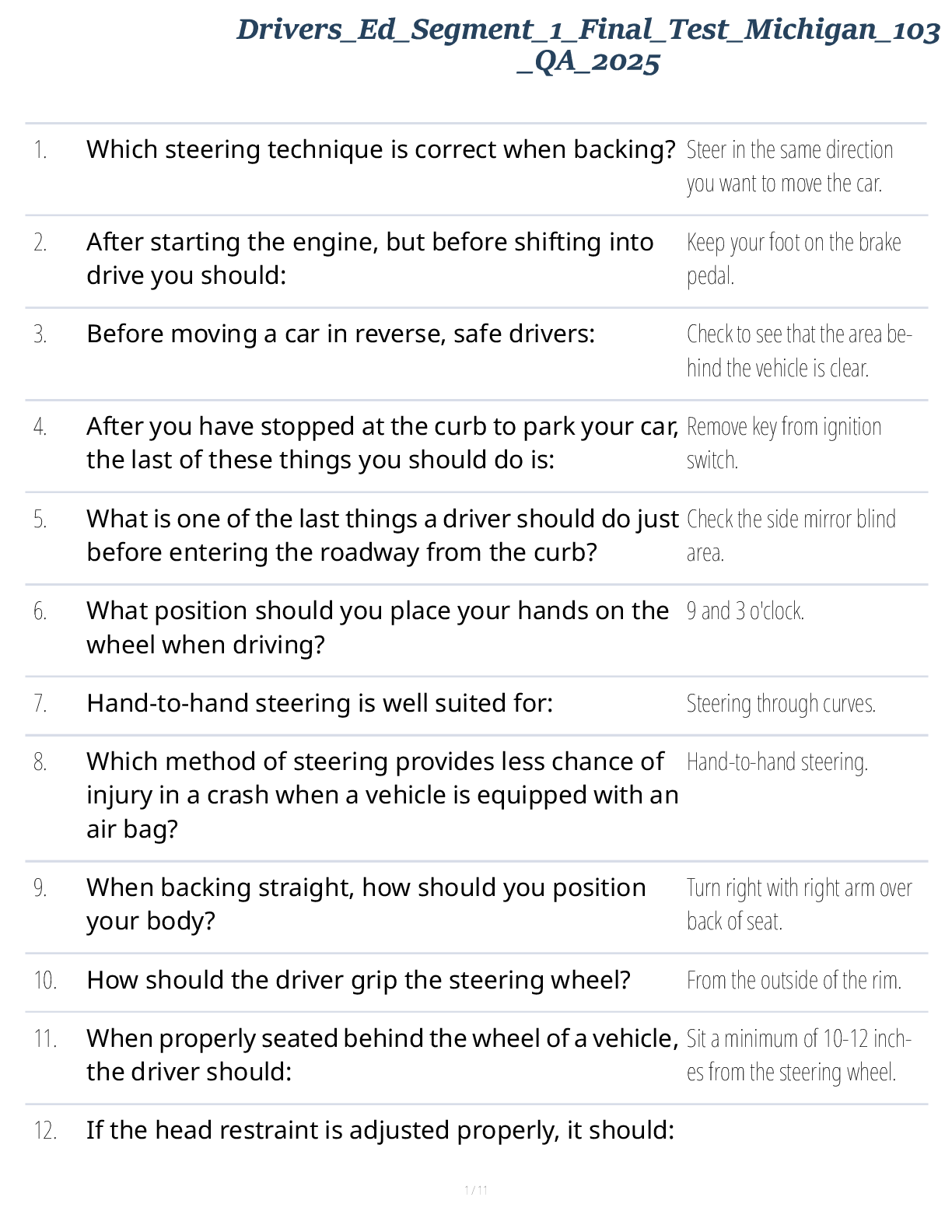 Driving Course > STUDY GUIDE > Drivers Ed Segment 1 Final Test Michigan 103 QA 2025 (All)