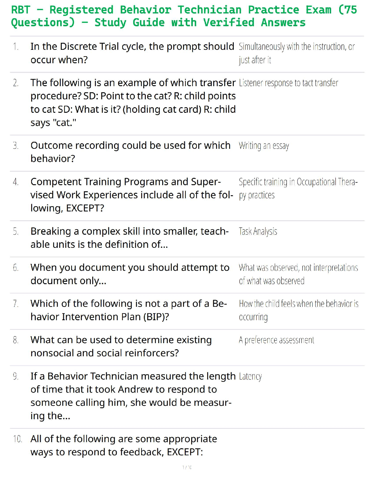 Registered Behaviour Technician (RBT) > STUDY GUIDE > RBT Practice Exam (75 Questions) — Study Guide, Class Notes & Test Bank (Registered Behavior Technician Prep) (All)