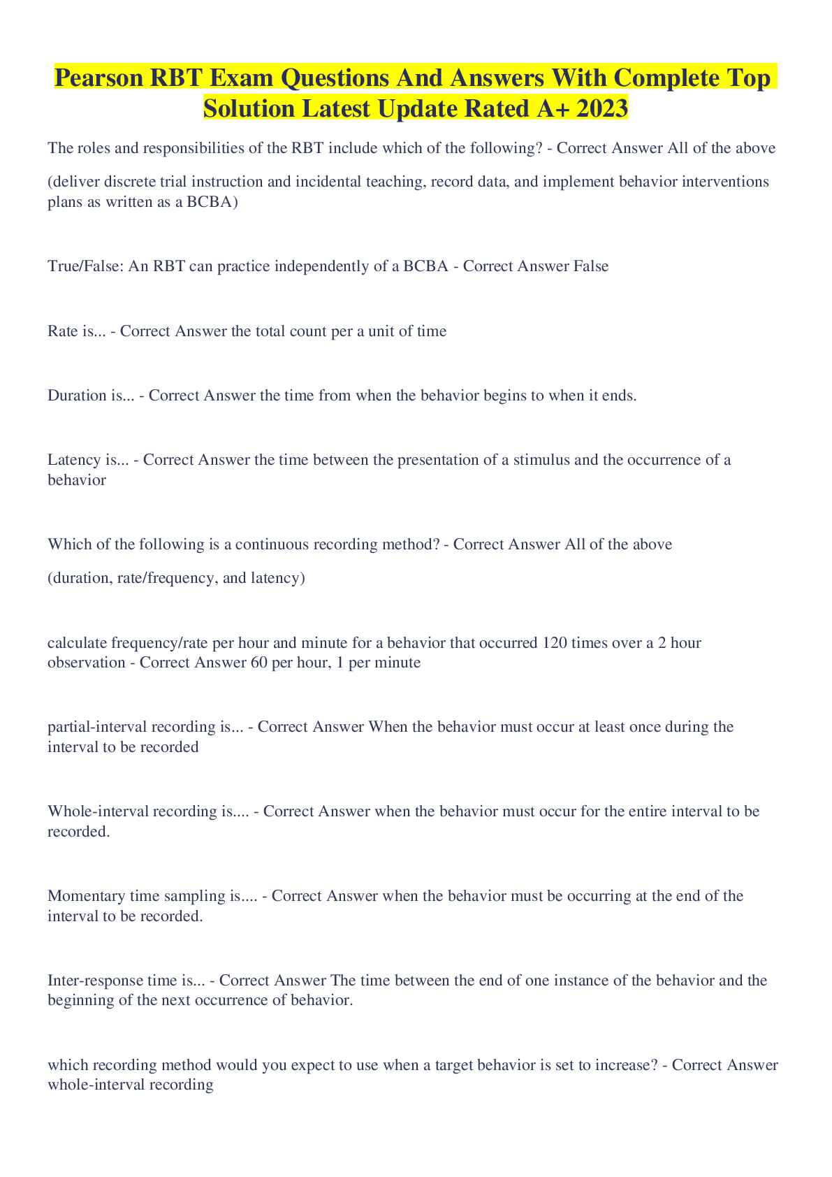 Registered Behaviour Technician (RBT) > QUESTIONS & ANSWERS > Pearson RBT Exam Questions and answers, 100% Accurate, graded A+ (All)