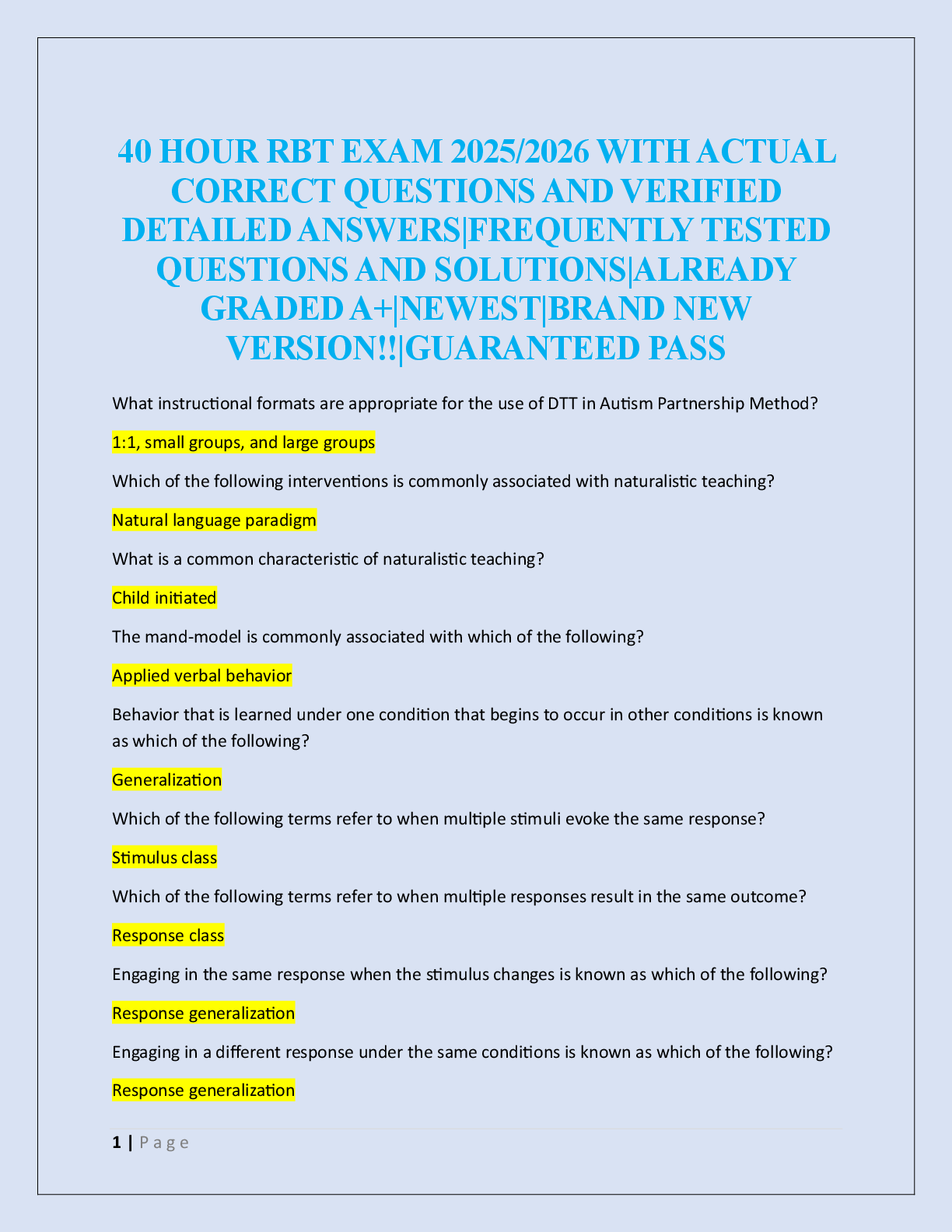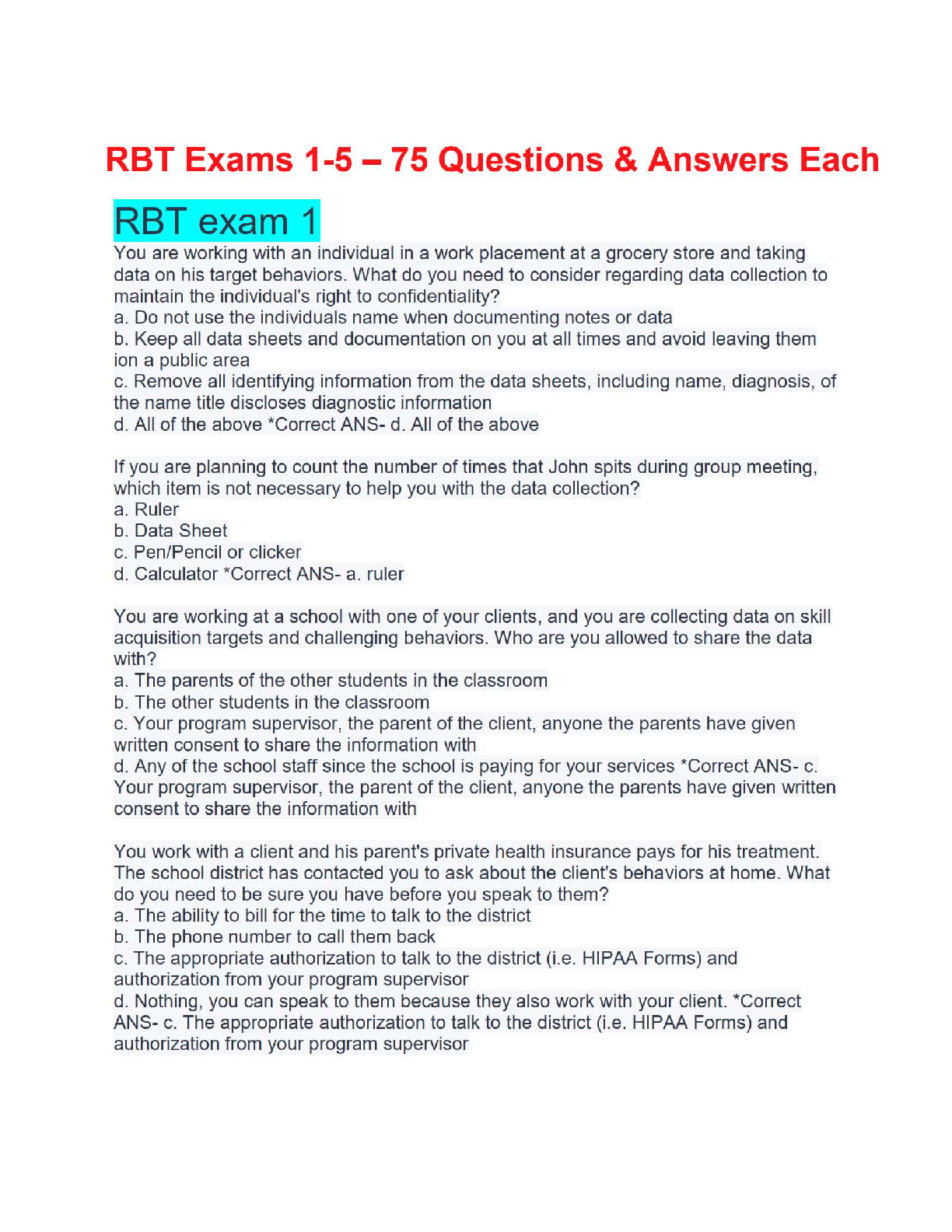 Registered Behaviour Technician (RBT) > EXAM > 📘 RBT Exams 1-5 – 75 Questions & Answers Each (All)