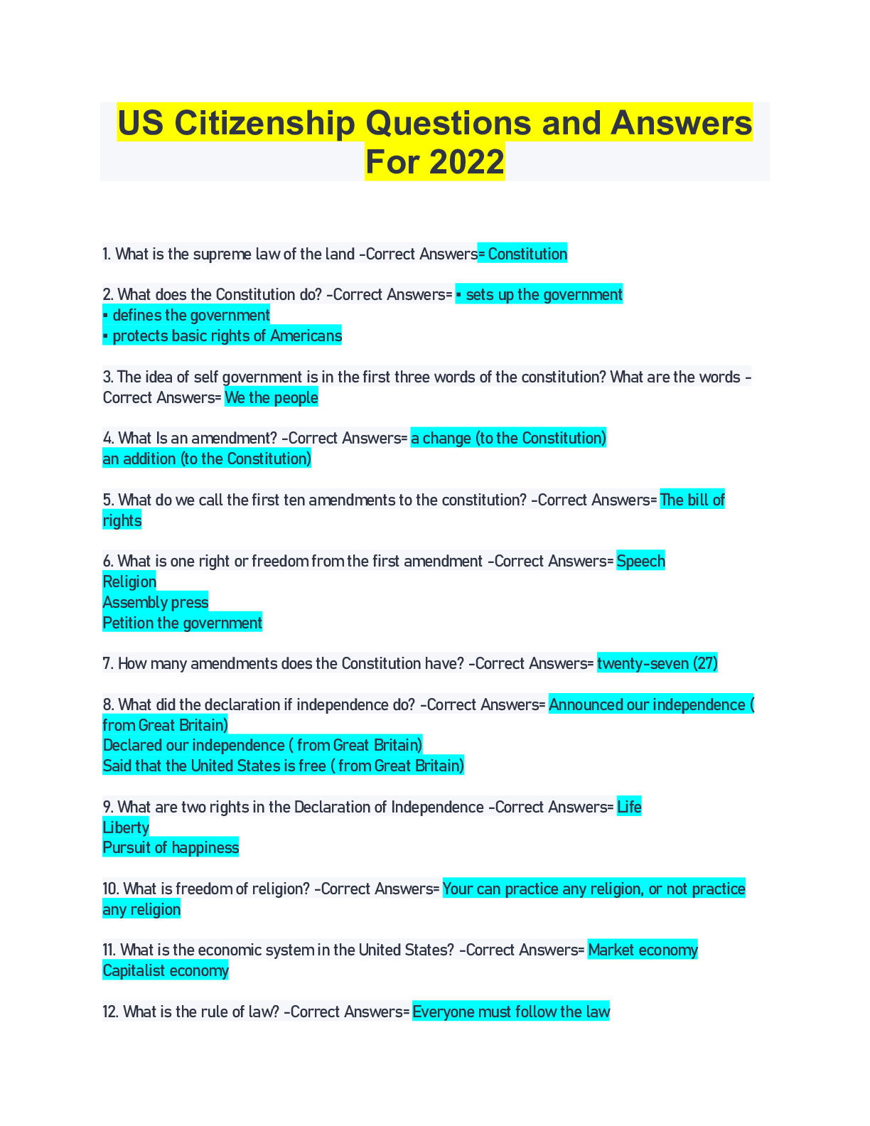 History > EXAM > US Citizenship Questions and Answers For 2022 (All)