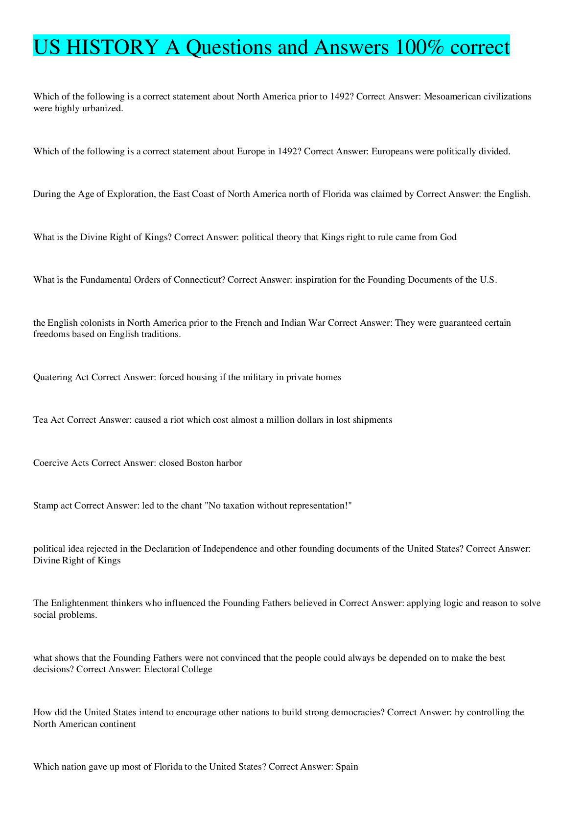 History > EXAM > US HISTORY A Questions and Answers 100% correct (All)