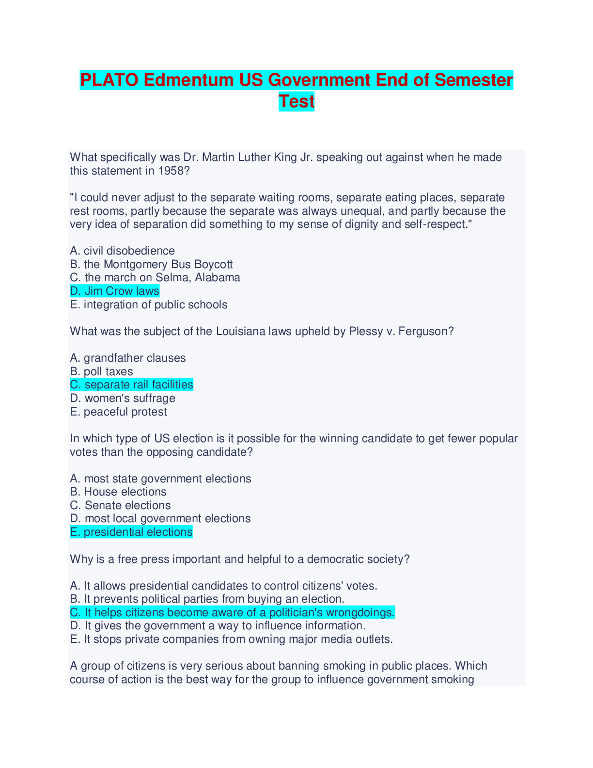 History > EXAM > PLATO Edmentum US Government End of Semester Test - 100% Correct Answers (All)