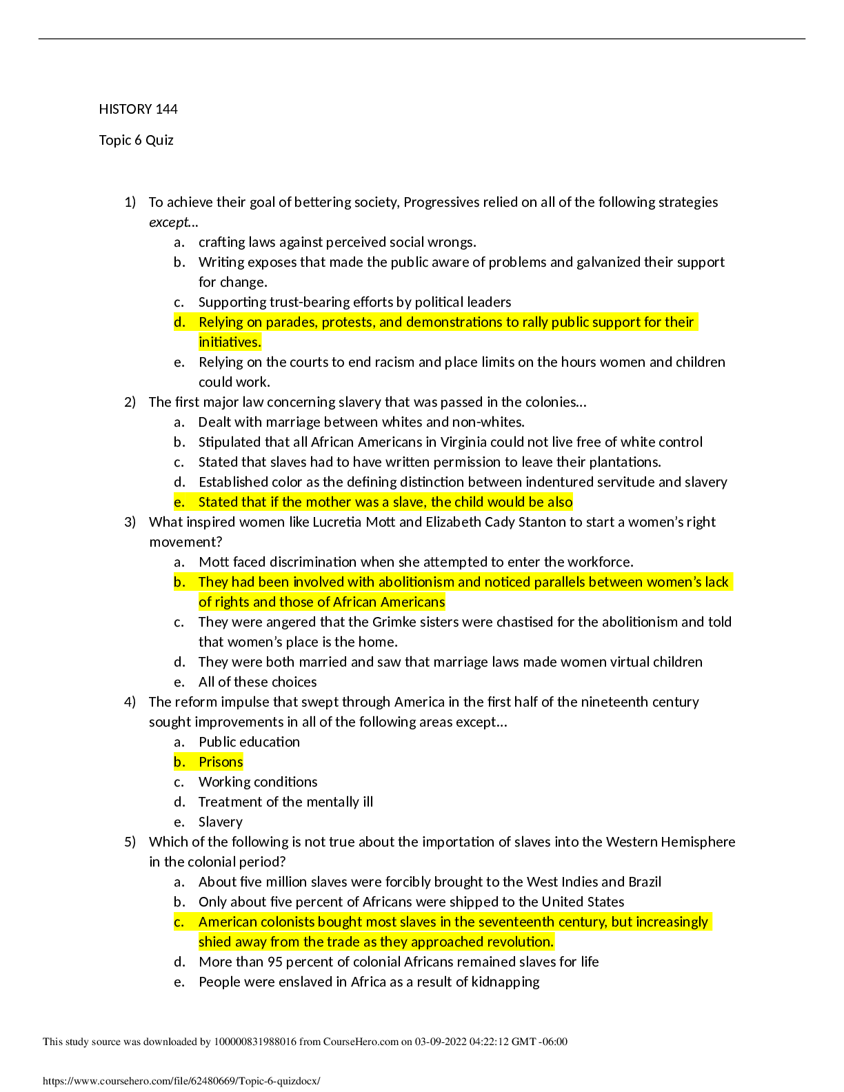 History > QUESTIONS & ANSWERS > Grand Canyon University HISTORY 144 Topic 6 Quiz (All)