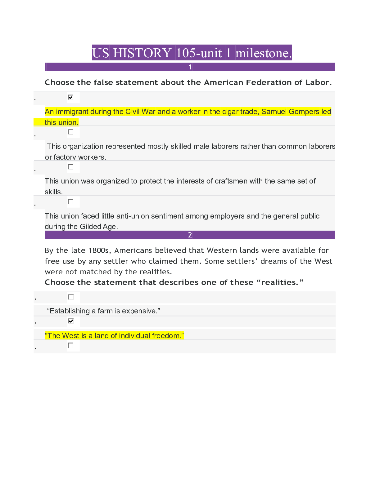 History > EXAM > US HISTORY 105 us history since 1865 Unit 1 milestone quiz (answered) latest 2021 (100% correct) (All)