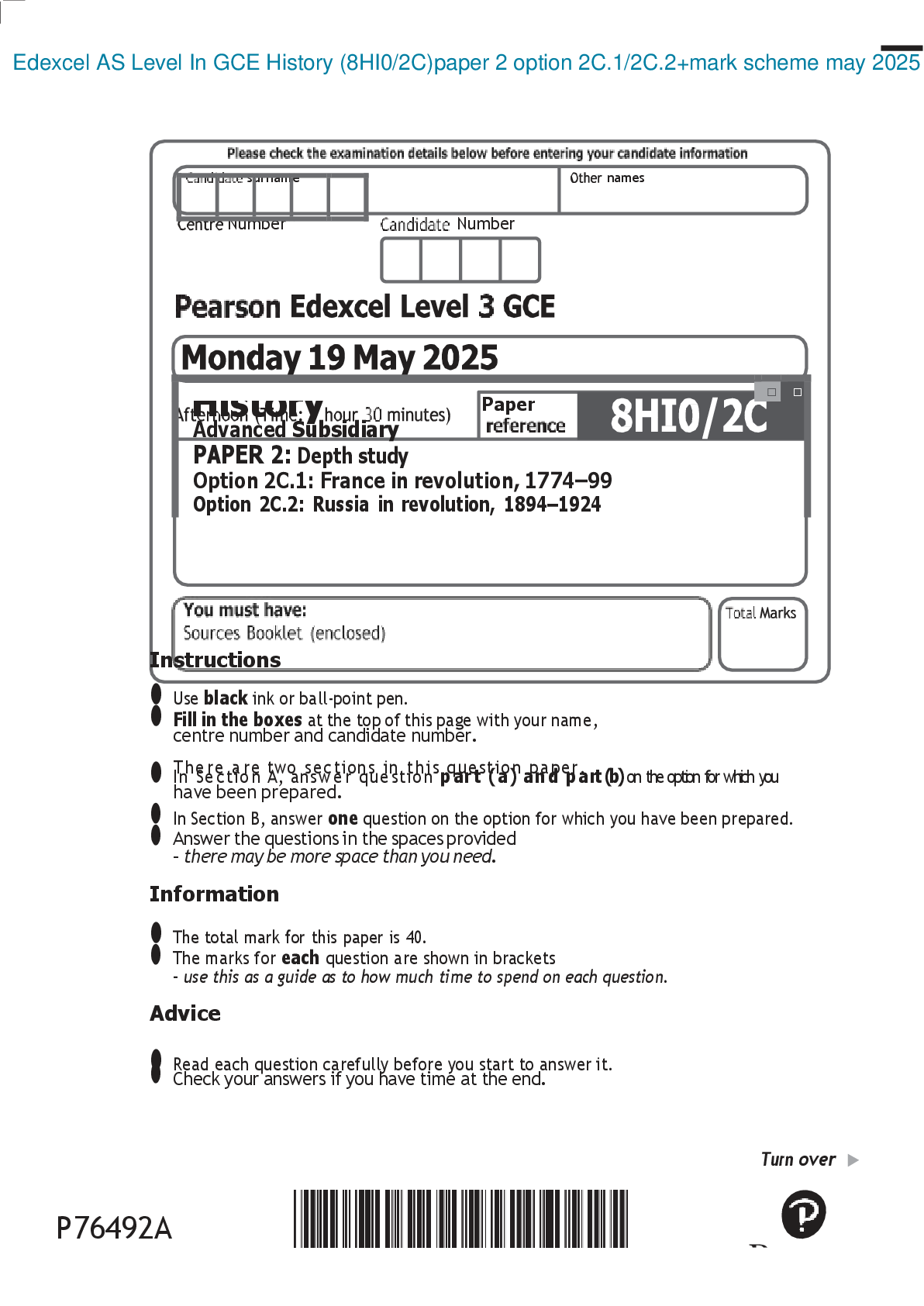 History > Edexcel Question Paper > Pearson Edexcel A Level 3 GCE 9HI0/2C History Advanced PAPER 2: Depth study Option 2C.1: France in revolution, 1774–99 Option 2C.2: Russia in revolution, 1894–1924. QP June 2022 (All)