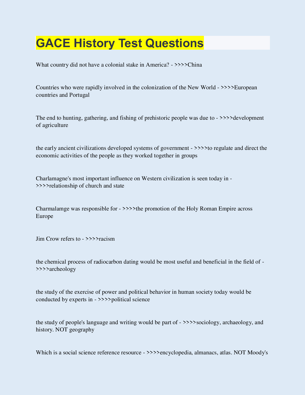 History > EXAM > GACE History Test Questions | 150 Questions with 100% Correct Answers | Updated & Verified (All)