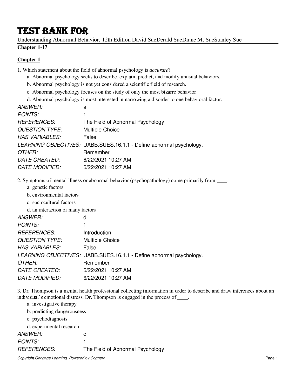 Organizational Behavior > TEST BANKS > Test BANK For Understanding Abnormal Behavior,12th Edition David Sue Derald SueDiane M. Sue Stanley Sue Chapter 1-17 A+ (All)
