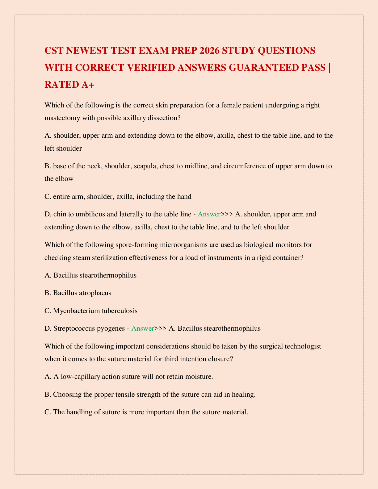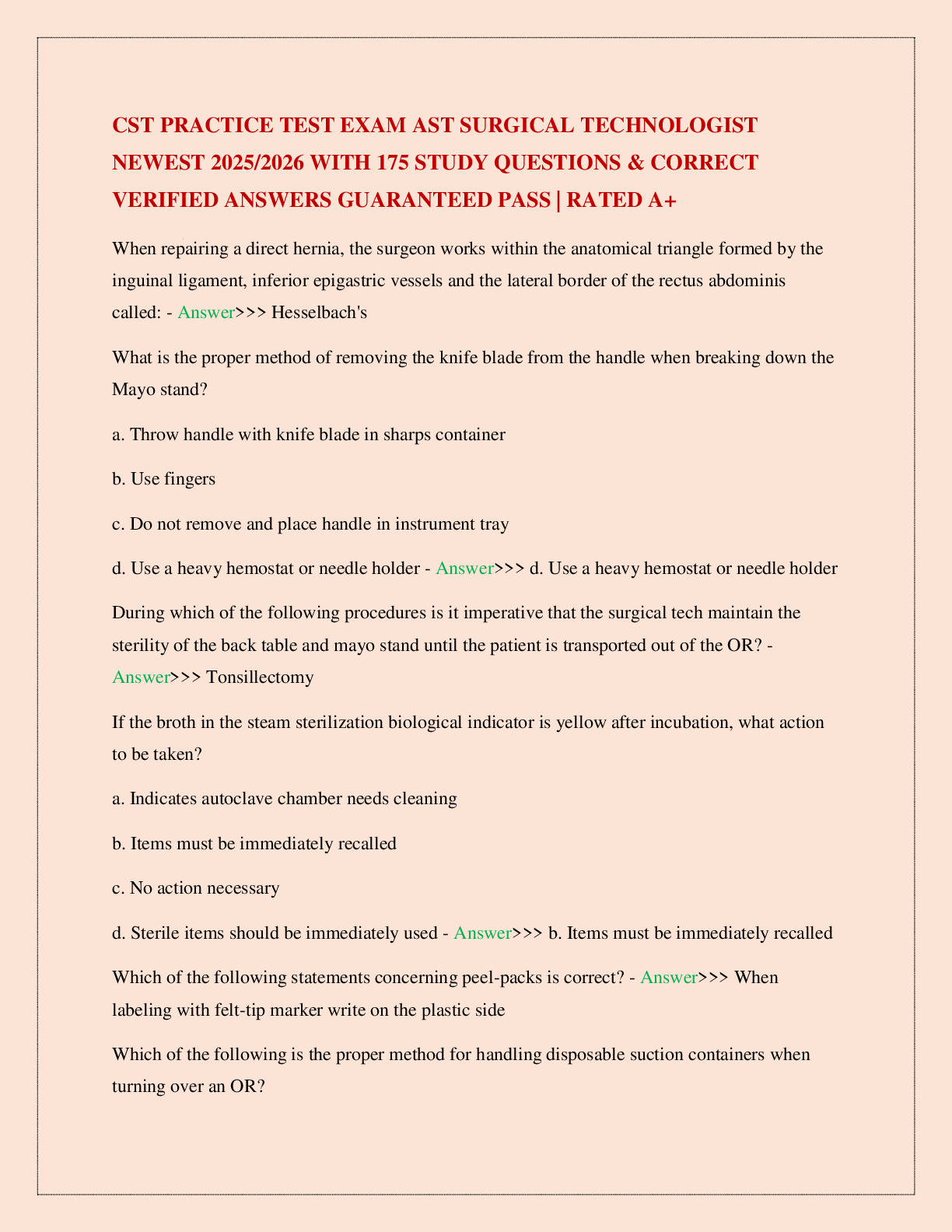 Central Service Technician (CST) > EXAM > CST PRACTICE TEST EXAM AST SURGICAL TECHNOLOGIST NEWEST 2025/2026 WITH 175 STUDY QUESTIONS & CORRECT VERIFIED ANSWERS GUARANTEED PASS | RATED A+ (All)