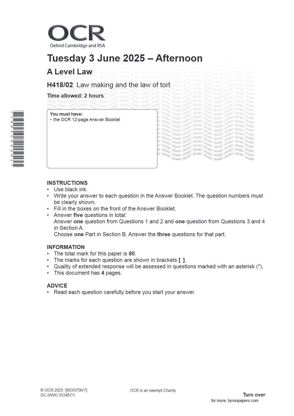Law > A-Level Question Paper > OCR A Level Law H418/02 Law making and the law of tort JUNE 2025 (All)
