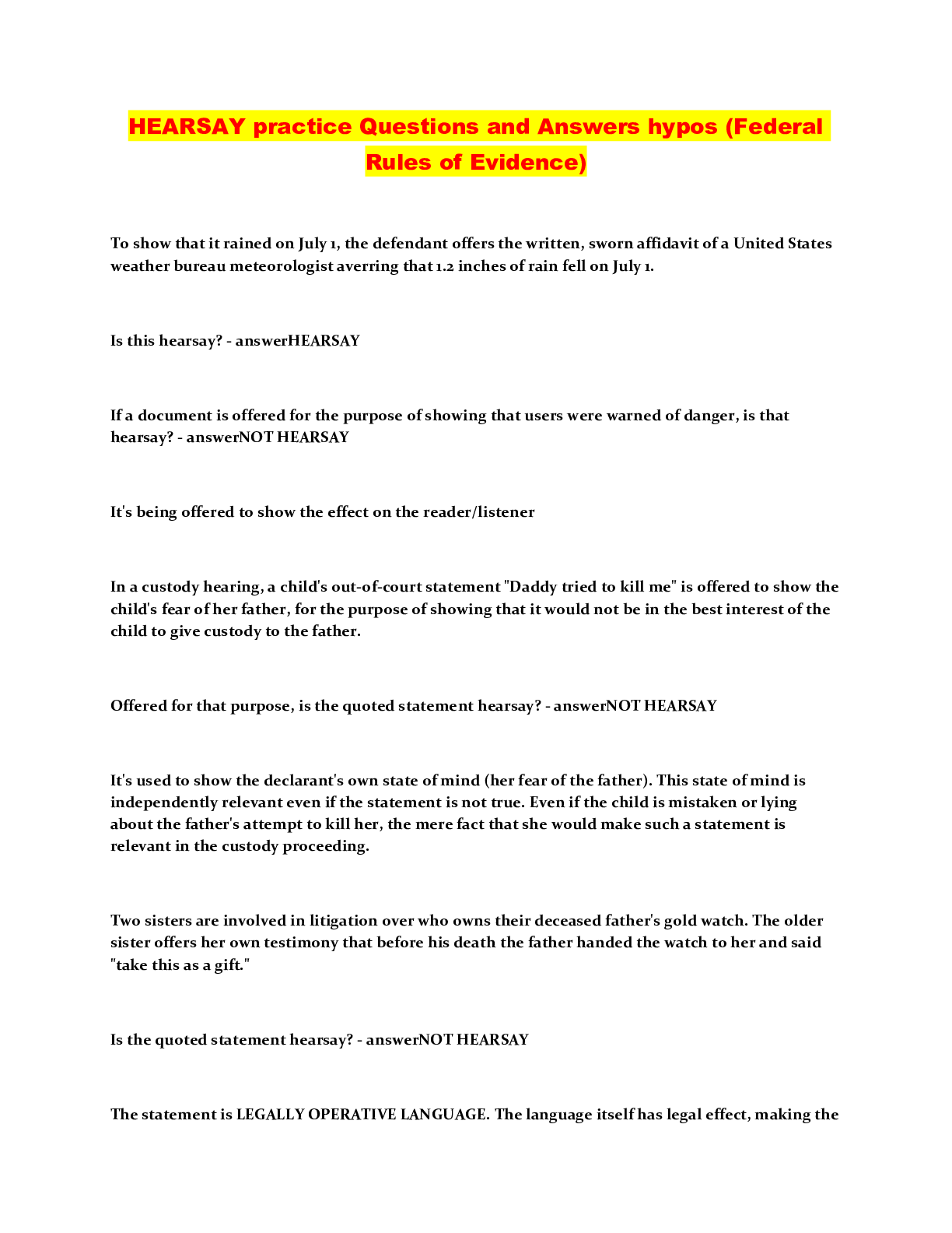 Law > QUESTIONS & ANSWERS > HEARSAY practice Questions and Answers hypos (Federal Rules of Evidence) (All)