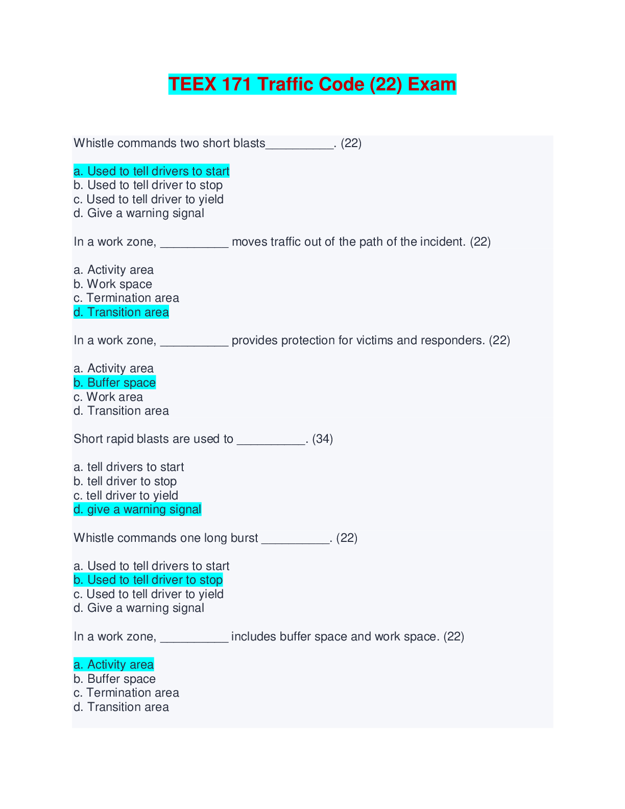 Law > EXAM > TEEX 171 Traffic Code (22) Exam - Questions and Answers (All)