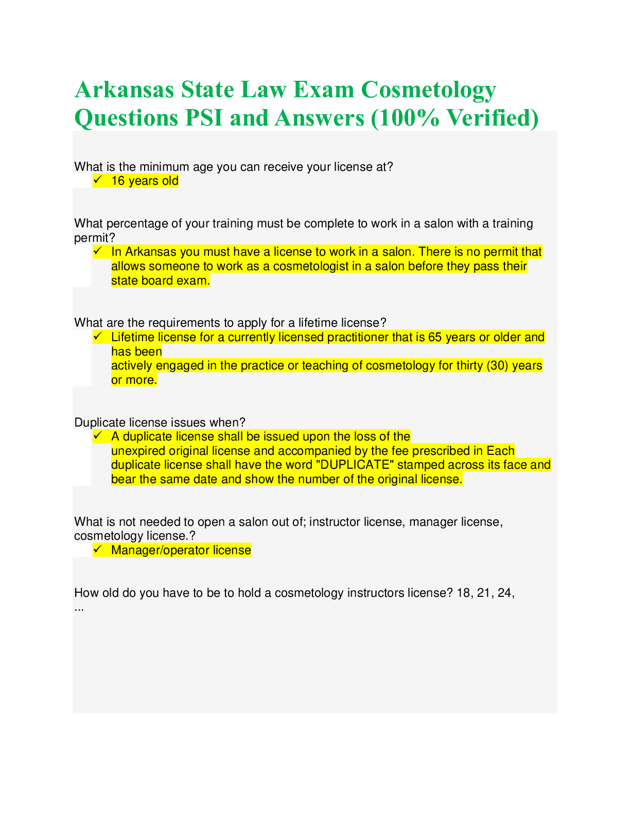 Law > EXAM > Arkansas State Law Exam Cosmetology Questions PSI and Answers (100% Verified) (All)