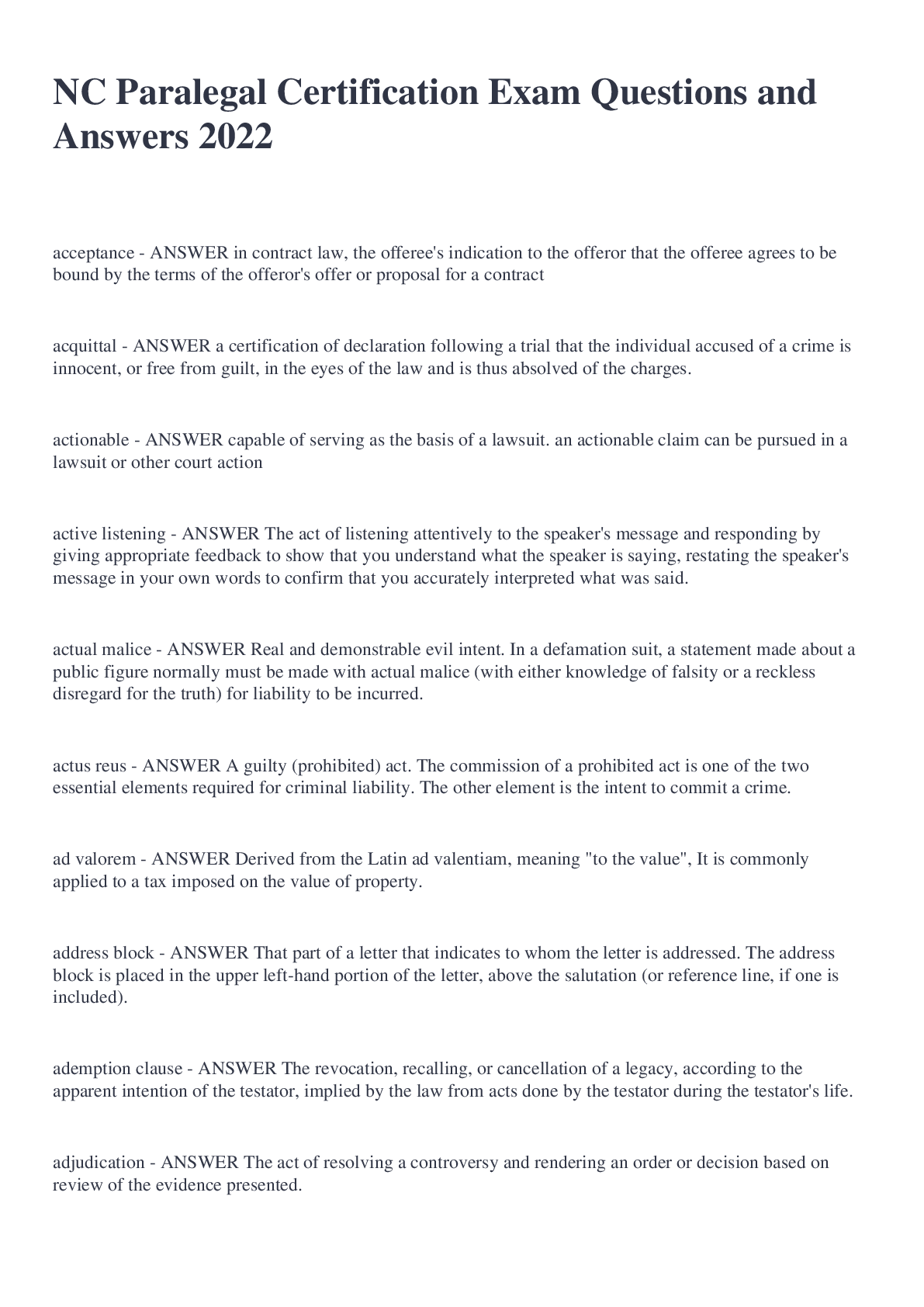Law > EXAMs > NC Paralegal Certification Exam Questions and Answers 2022 (All)