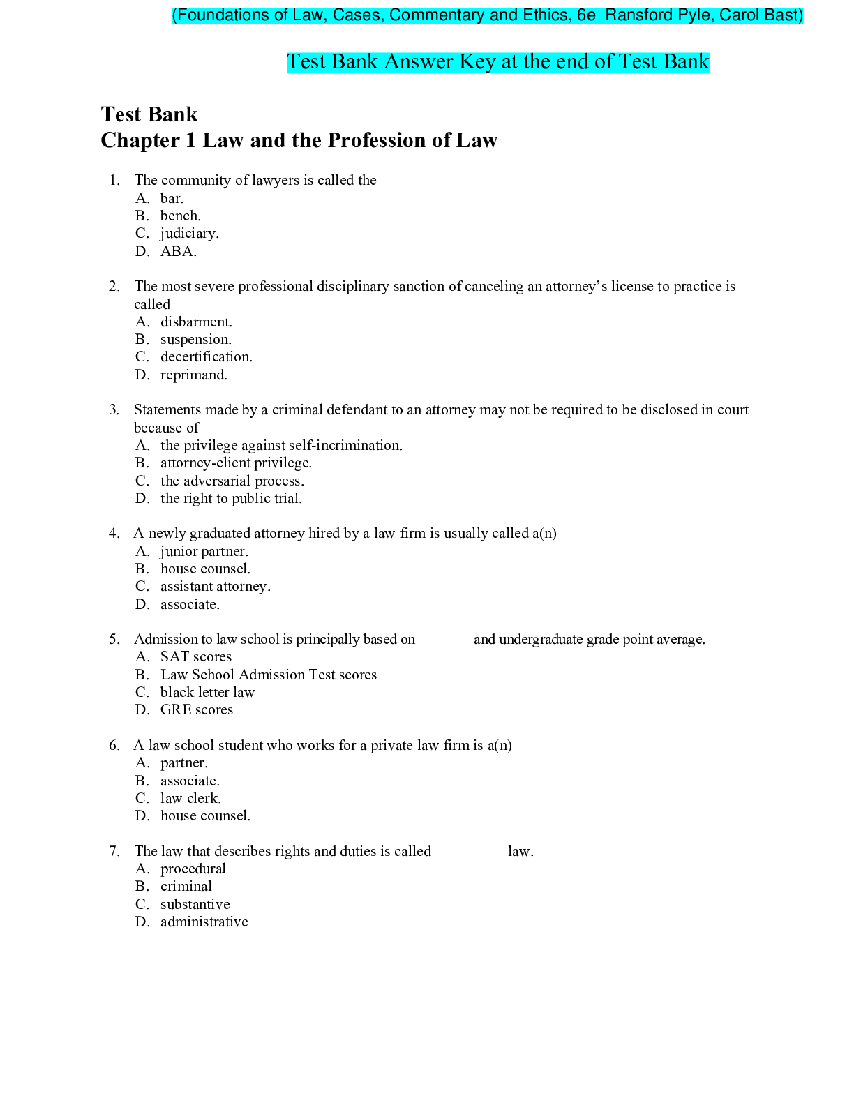 Law > TEST BANKS > Foundations of Law, Cases, Commentary and Ethics, 6e Ransford Pyle, Carol Bast (Test Bank) (All)