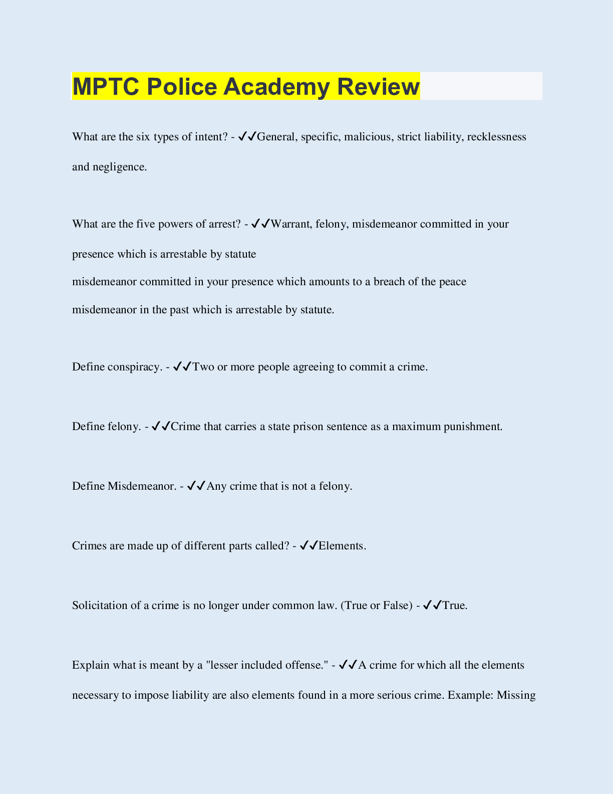 Law > QUESTIONS & ANSWERS > MPTC Exam Study Guide (All)