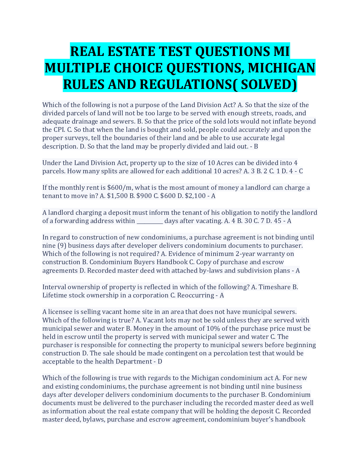 Law > EXAM > REAL ESTATE TEST QUESTIONS MI MULTIPLE CHOICE QUESTIONS, MICHIGAN RULES AND REGULATIONS( SOLVED) (All)