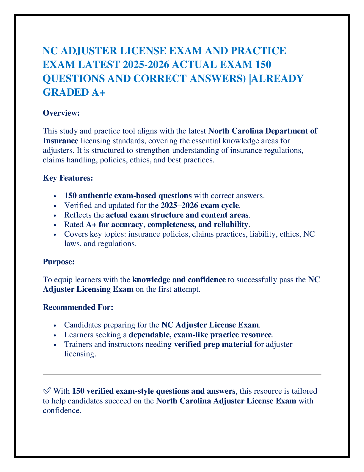 Law > EXAM > NC ADJUSTER LICENSE EXAM AND PRACTICE EXAM LATEST 2025-2026 ACTUAL EXAM 150 QUESTIONS AND CORRECT ANSWERS) |ALREADY GRADED A+ (All)