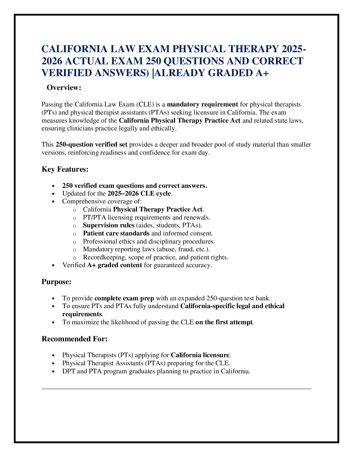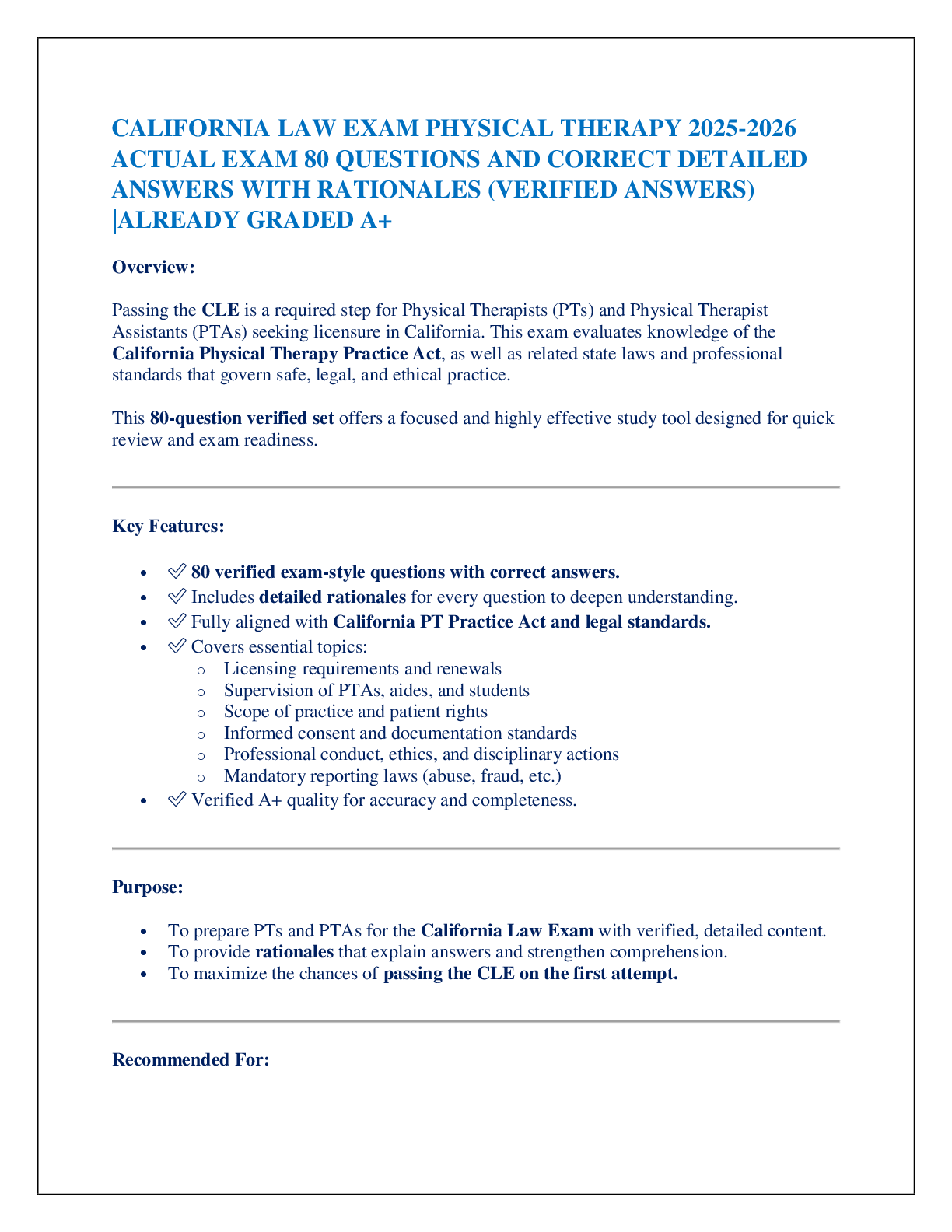 Law > EXAM > CALIFORNIA LAW EXAM PHYSICAL THERAPY 2025-2026 ACTUAL EXAM 80 QUESTIONS AND CORRECT DETAILED ANSWERS WITH RATIONALES (VERIFIED ANSWERS) |ALREADY GRADED A+ (All)