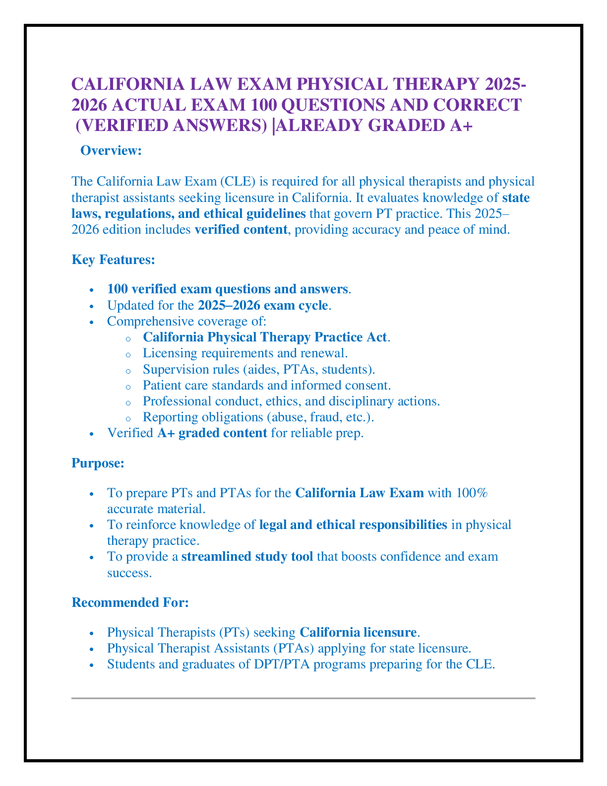 Law > EXAM > CALIFORNIA LAW EXAM PHYSICAL THERAPY 2025-2026 ACTUAL EXAM 100 QUESTIONS AND CORRECT (VERIFIED ANSWERS) |ALREADY GRADED A+ (All)