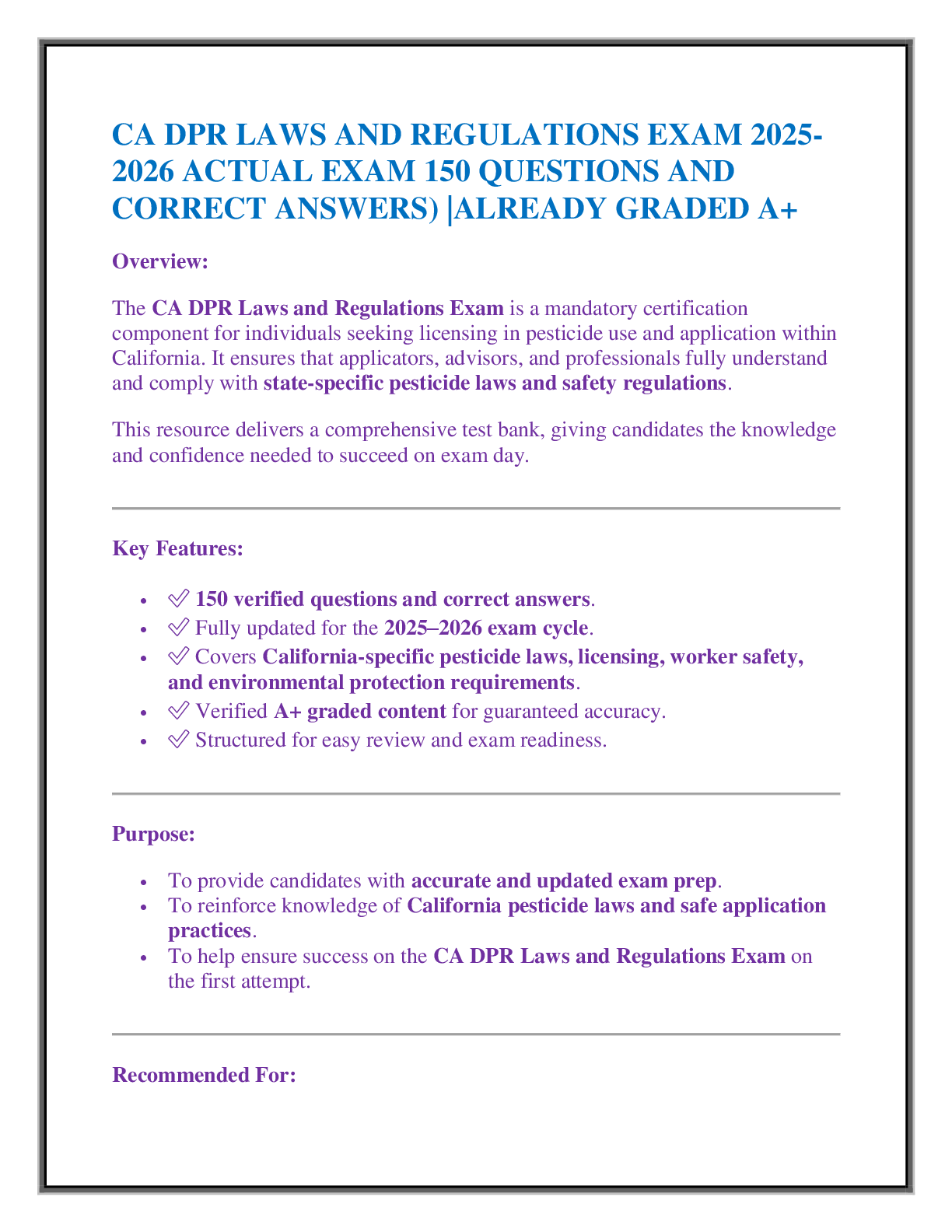 Law > EXAM > CA DPR LAWS AND REGULATIONS EXAM 2025-2026 ACTUAL EXAM 150 QUESTIONS AND CORRECT ANSWERS) |ALREADY GRADED A+ (All)