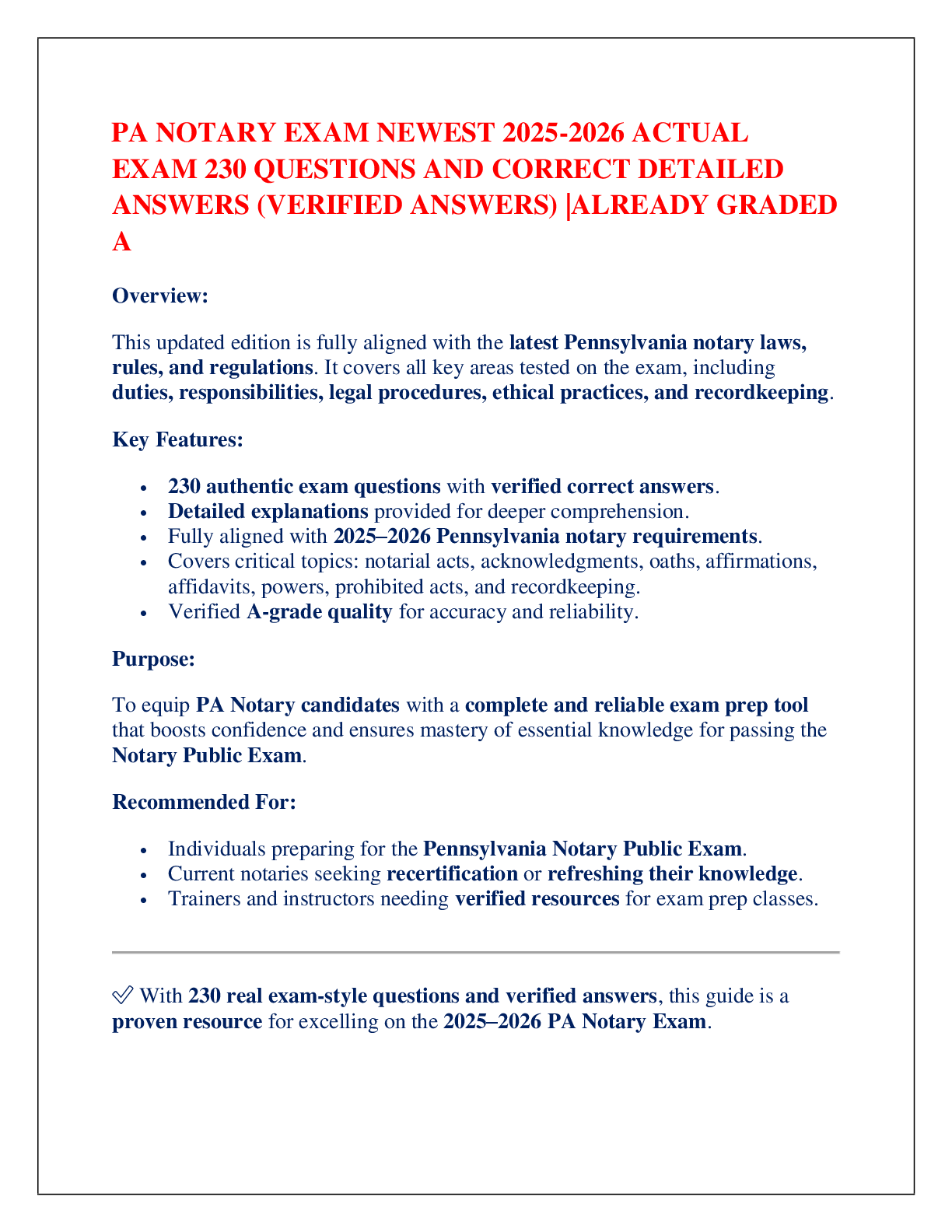 Law > EXAM > PA NOTARY EXAM NEWEST 2025-2026 ACTUAL EXAM 230 QUESTIONS AND CORRECT DETAILED ANSWERS (VERIFIED ANSWERS) |ALREADY GRADED A (All)