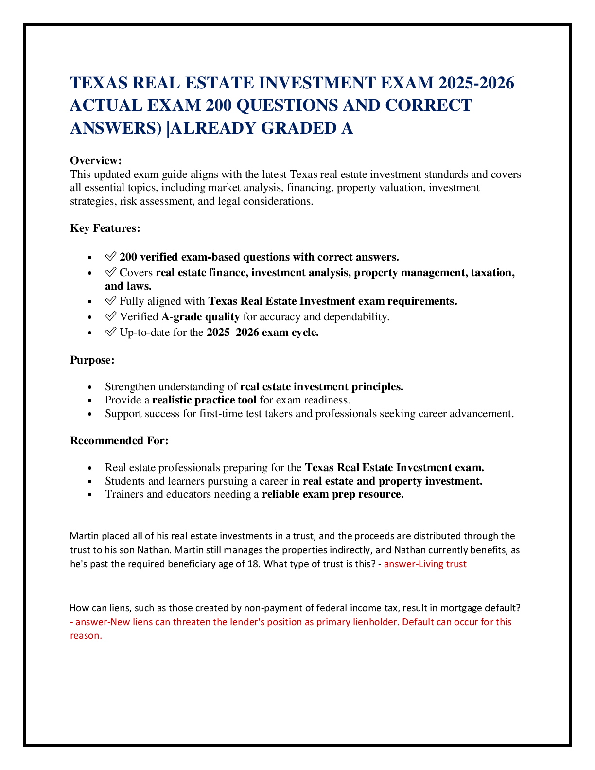 Law > EXAM > TEXAS REAL ESTATE INVESTMENT EXAM 2025-2026 ACTUAL EXAM 200 QUESTIONS AND CORRECT ANSWERS) |ALREADY GRADED A (All)