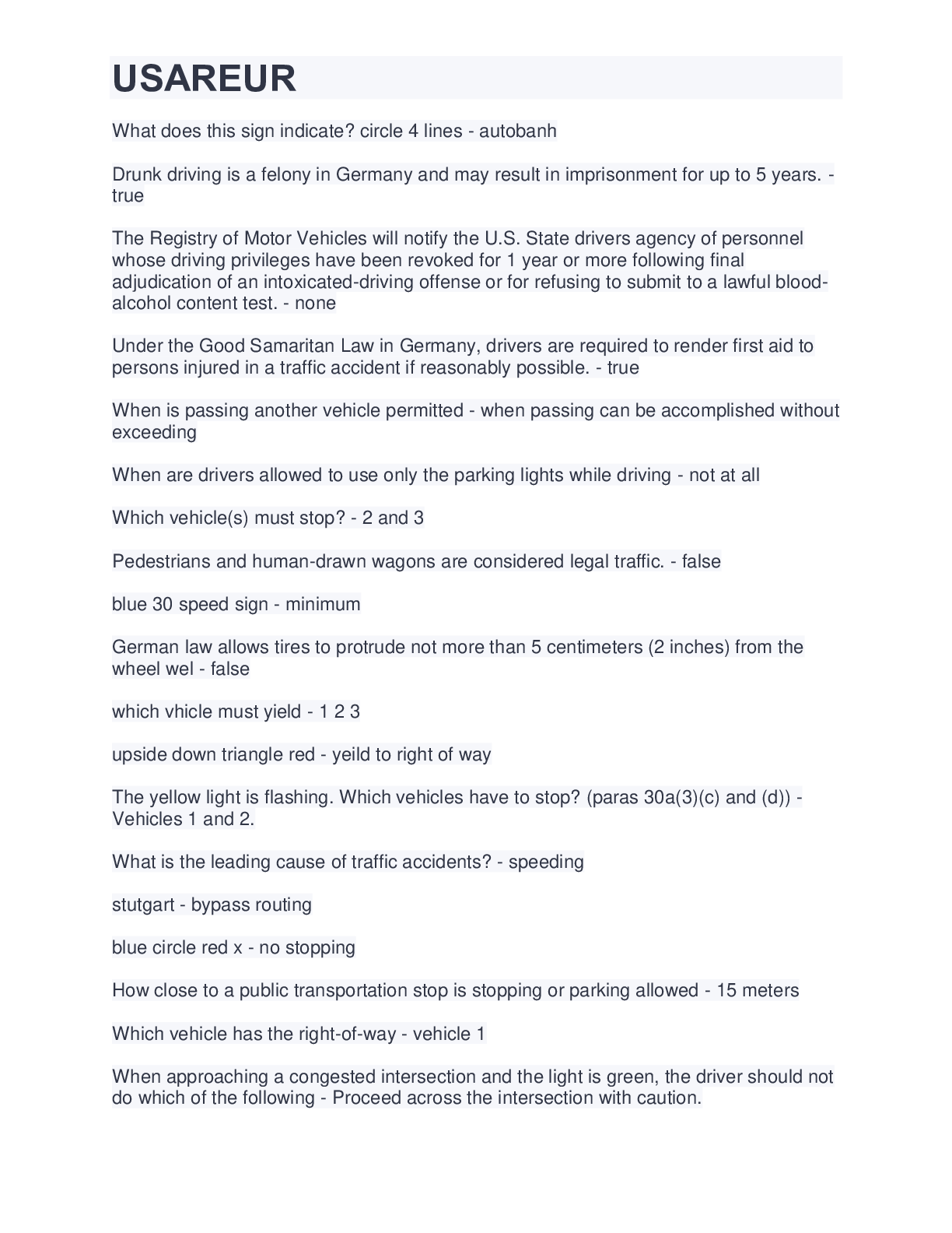 Law > QUESTIONS & ANSWERS > USAREUR, German Driver’s License, drivers test EU, USAREUR Practice Exam, German driving test 416 Questions and Answers (All)