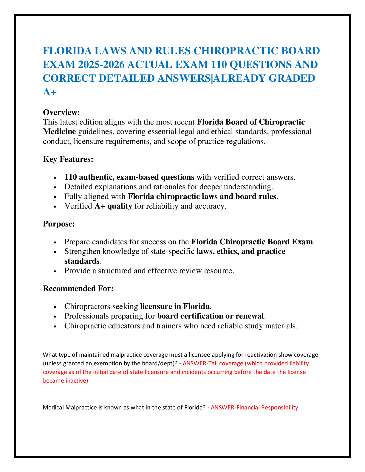 Law > EXAM > FLORIDA LAWS AND RULES CHIROPRACTIC BOARD EXAM 2025-2026 ACTUAL EXAM 110 QUESTIONS AND CORRECT DETAILED ANSWERS|ALREADY GRADED A+ (All)