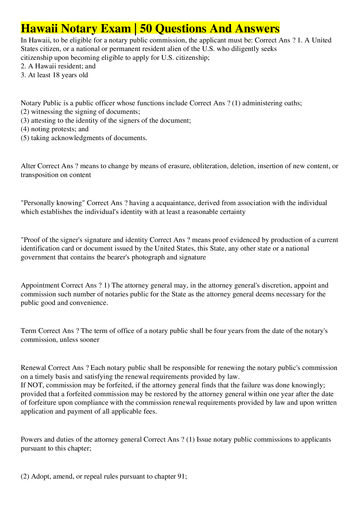 Law > EXAM > Hawaii Notary Exam | 50 Questions And Answers (All)