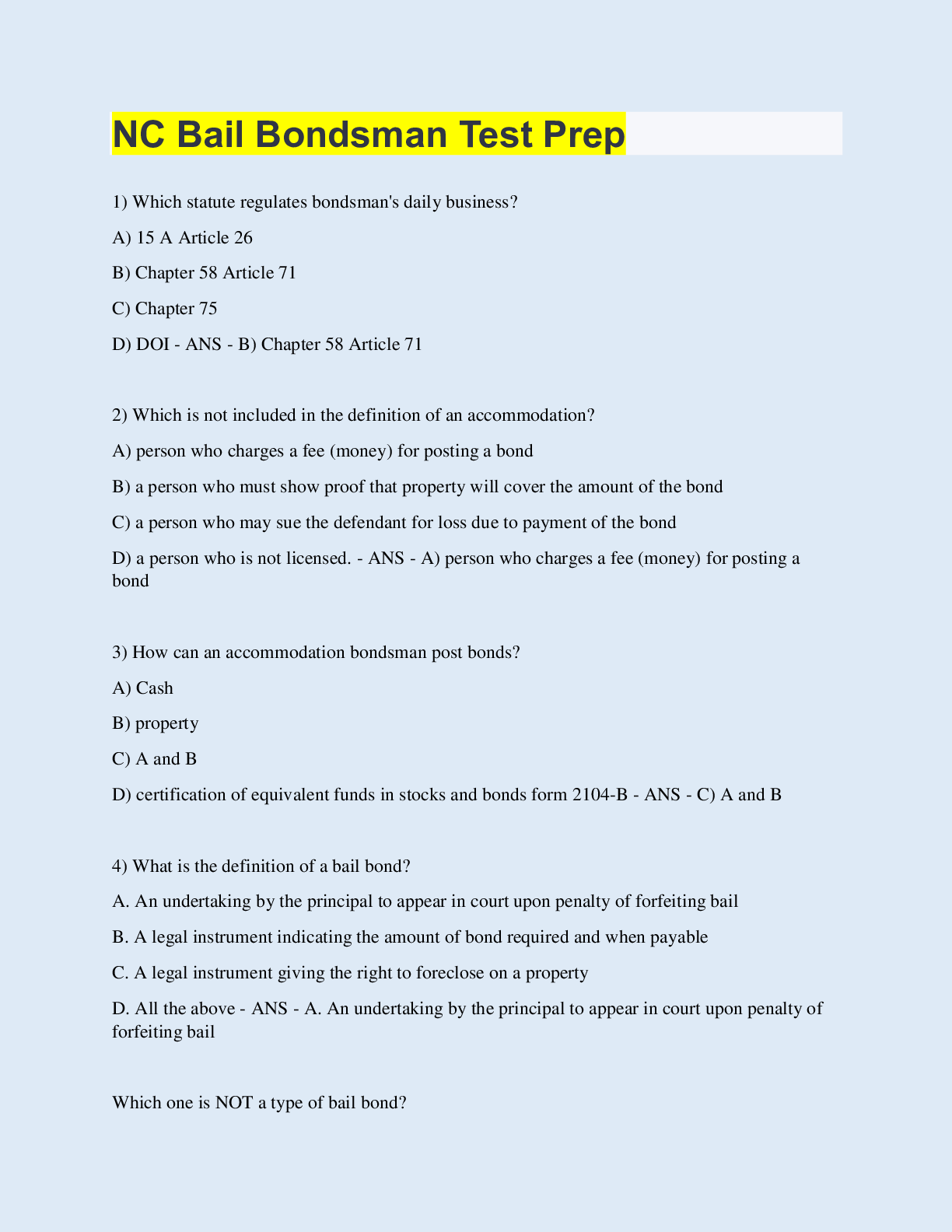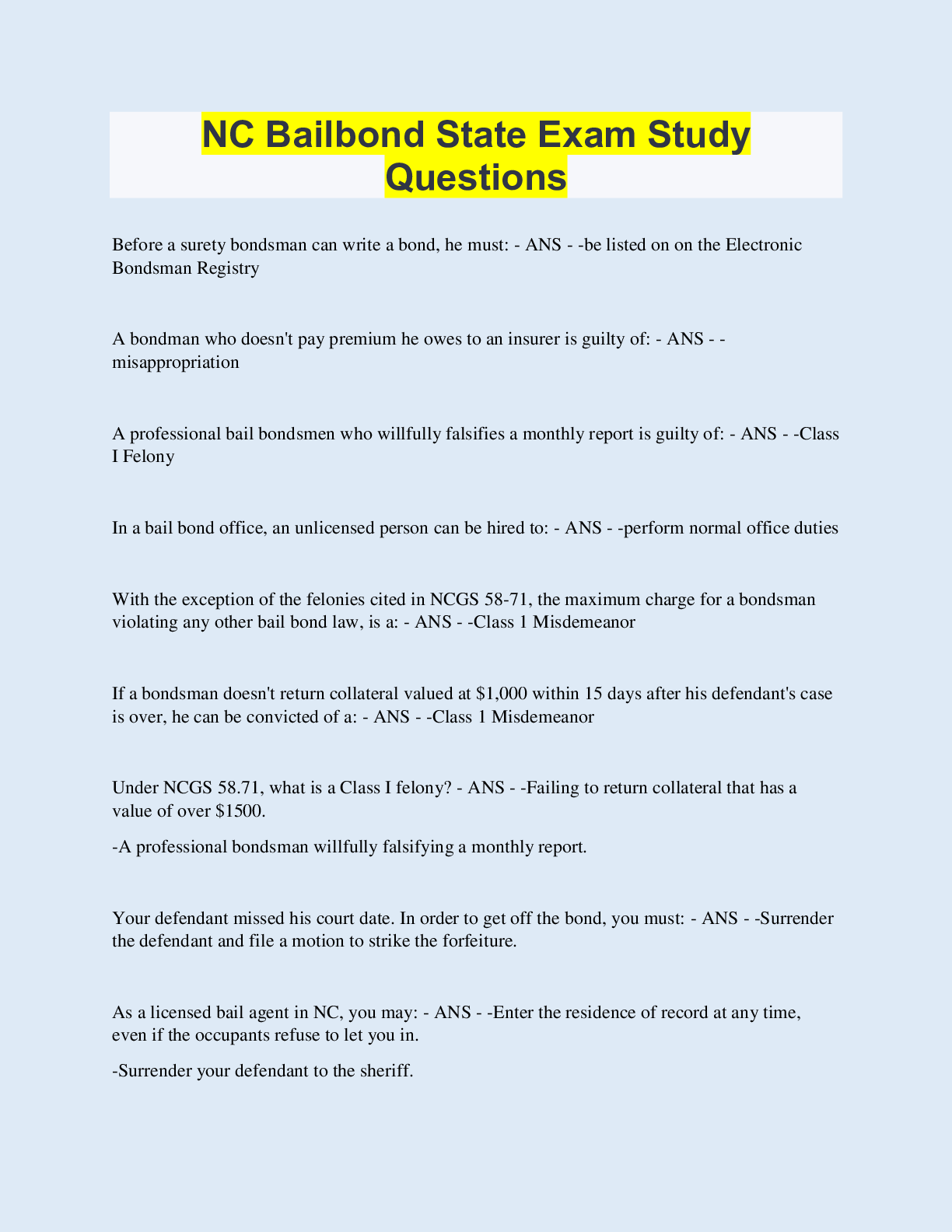 Law > EXAM > NC Bail Bondsman Test Prep | 200 Questions with 100% Correct Answers | Updated & Verified | 46 Pages (All)