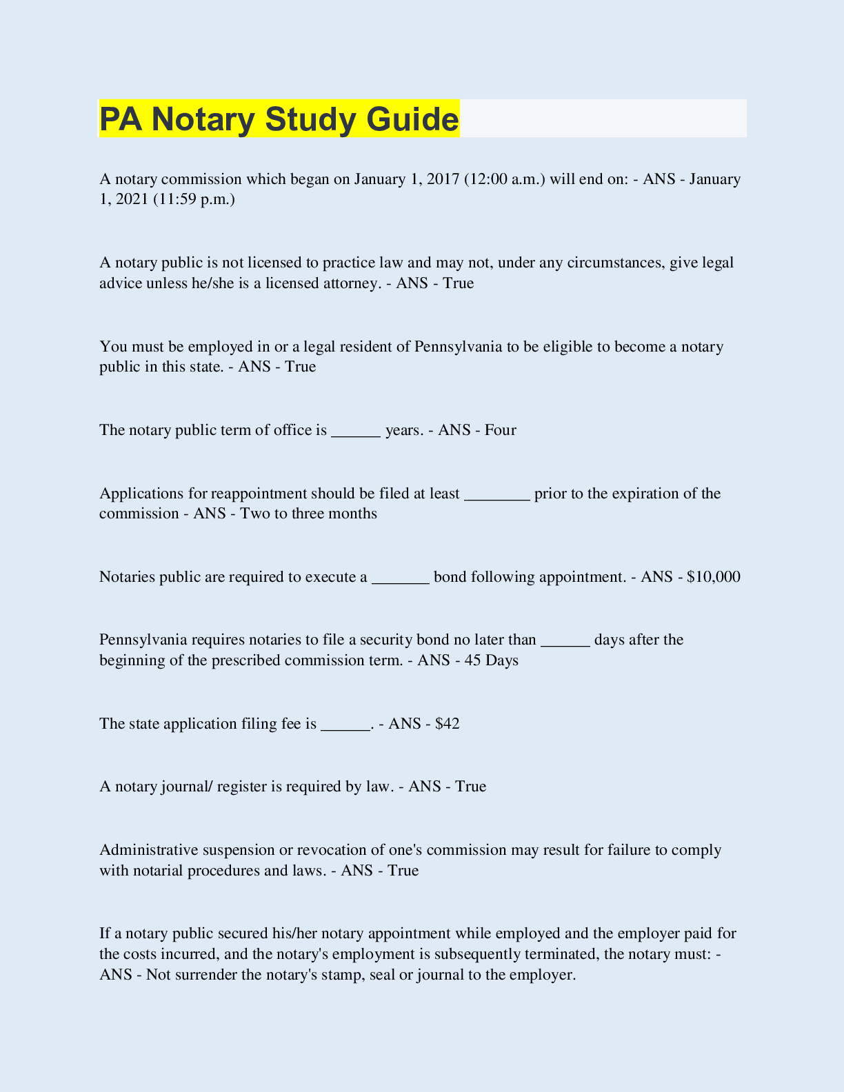 Law > EXAM > PA Notary Study Guide | 50 Questions with 100% Correct Answers | Updated & Verified (All)