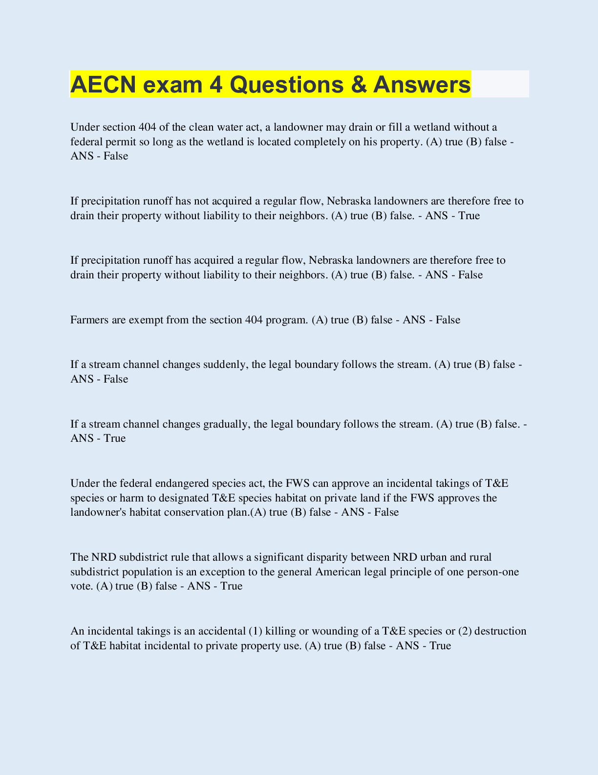 Law > EXAM > AECN exam 4 Questions & Answers | 220 Questions with 100% Correct Answers | Updated & Verified | 23 Pages (All)