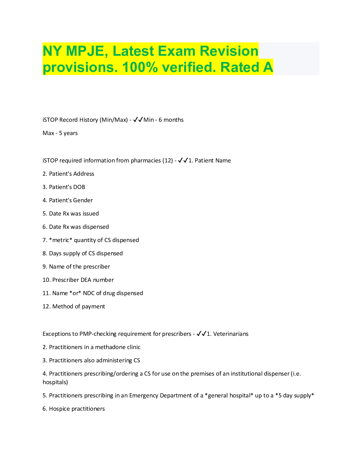 Law > QUESTIONS & ANSWERS > NY MPJE, Latest Exam Revision provisions. 100% verified. Rated A (All)