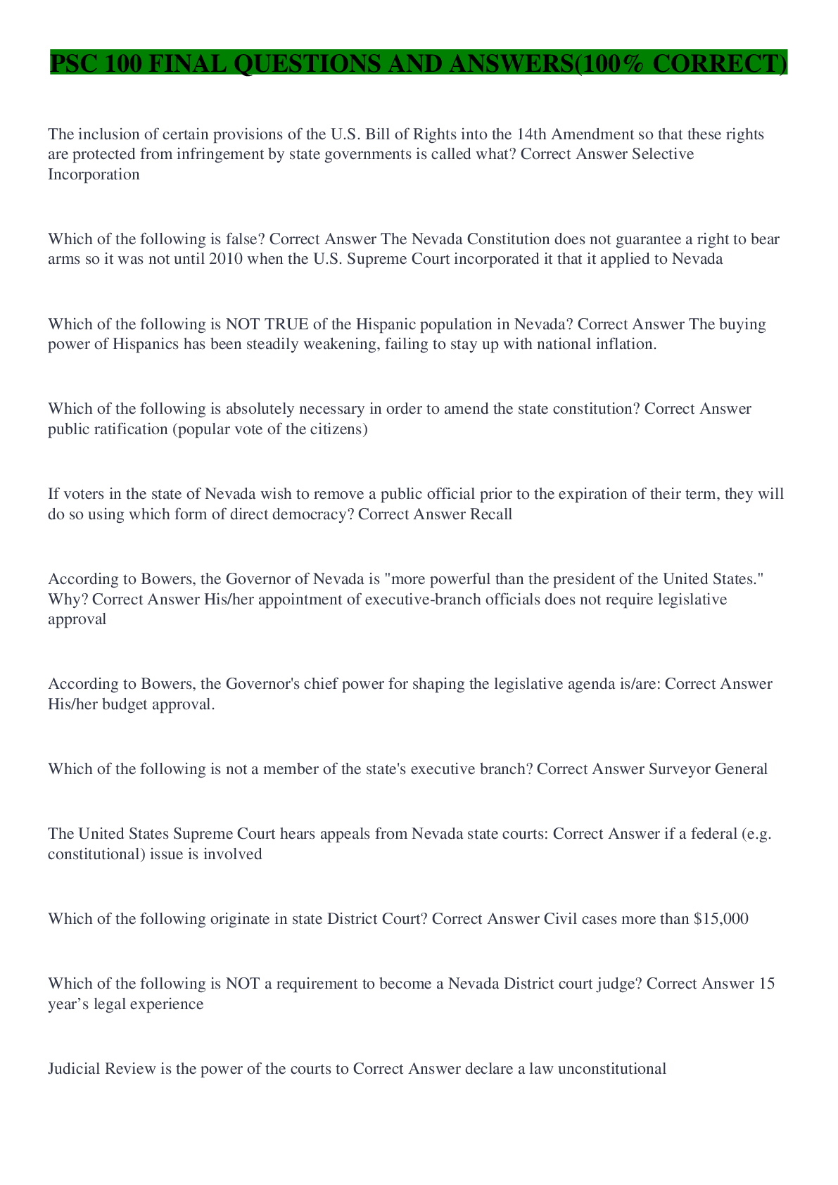 Law > QUESTIONS & ANSWERS > PSC 100 - FINAL EXAM STUDY GUIDE|QUESTIONS WITH CORRECT ANSWERS (All)