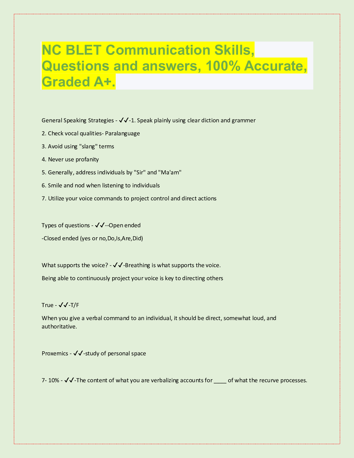 Law > QUESTIONS & ANSWERS > NC BLET Communication Skills, Questions and answers, 100% Accurate, Graded A+. (All)