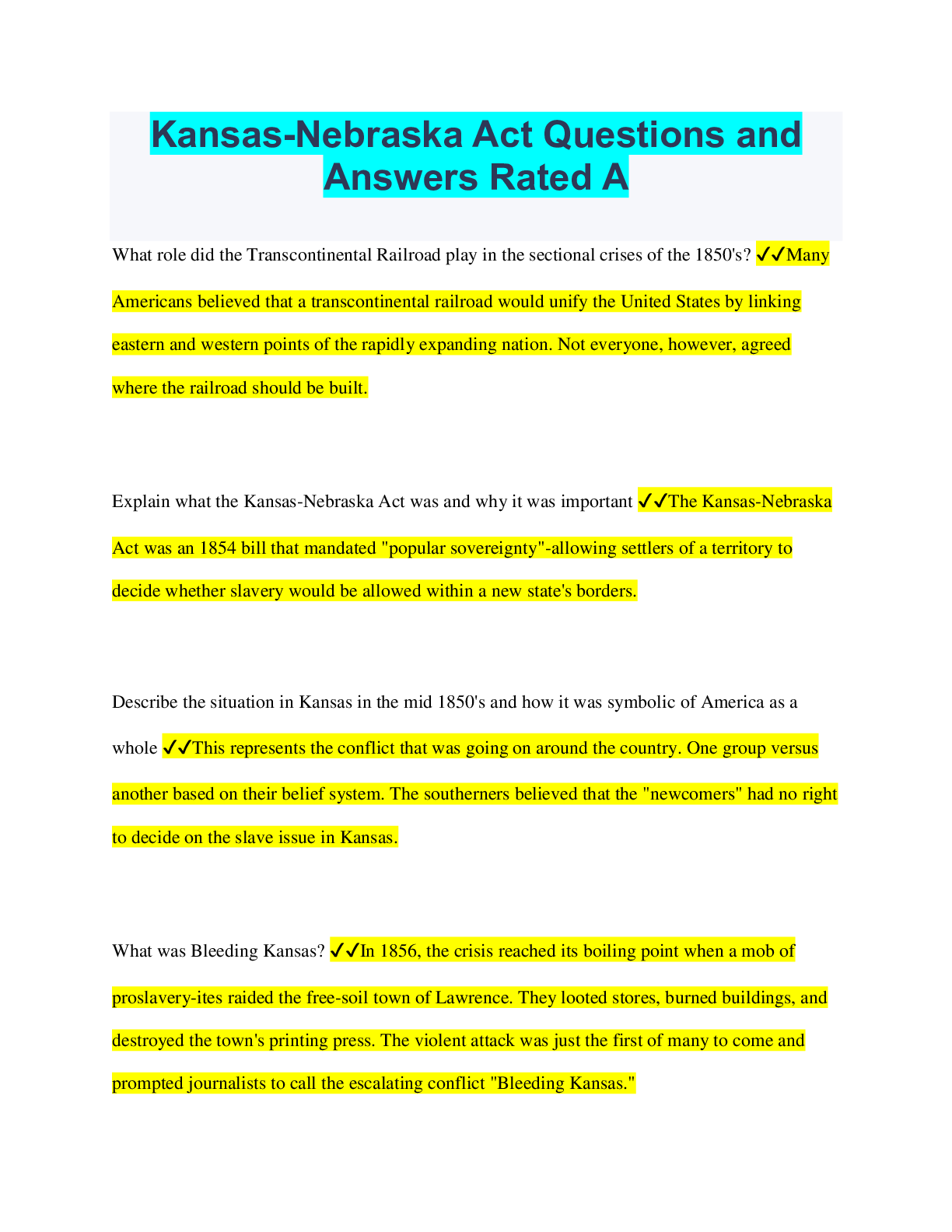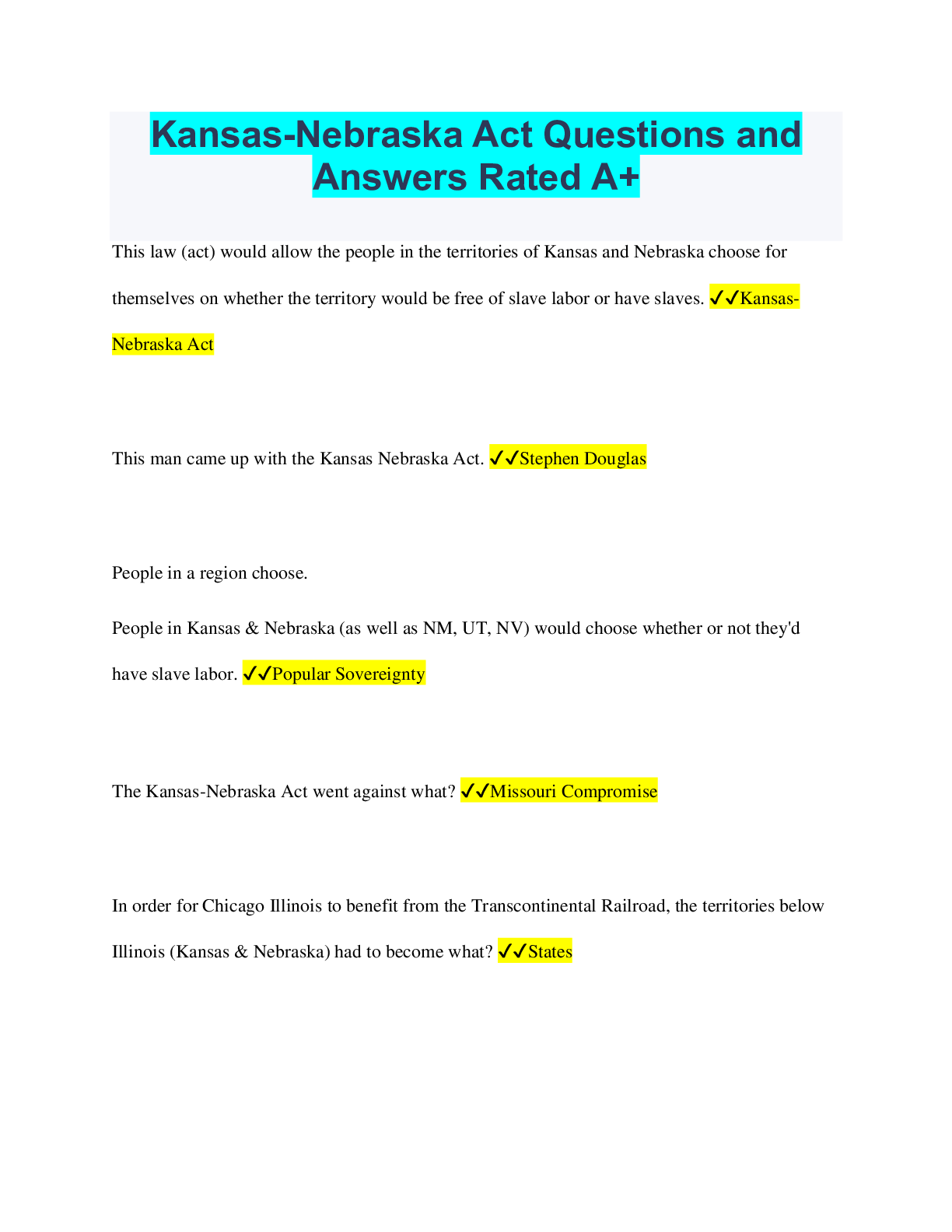 Law > QUESTIONS & ANSWERS > Kansas-Nebraska Act Questions and Answers Rated A (All)