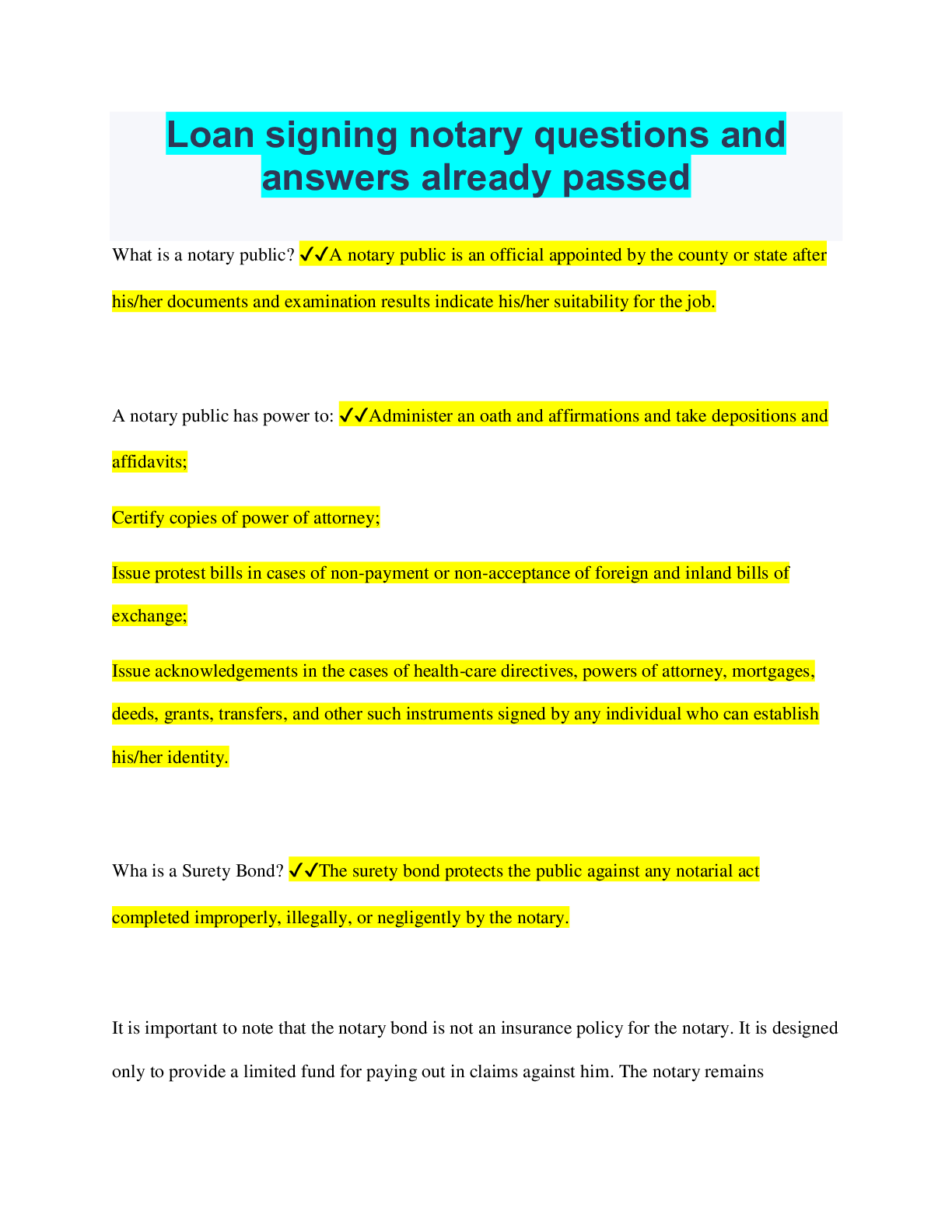 Law > QUESTIONS & ANSWERS > Loan signing notary questions and answers already passed (All)