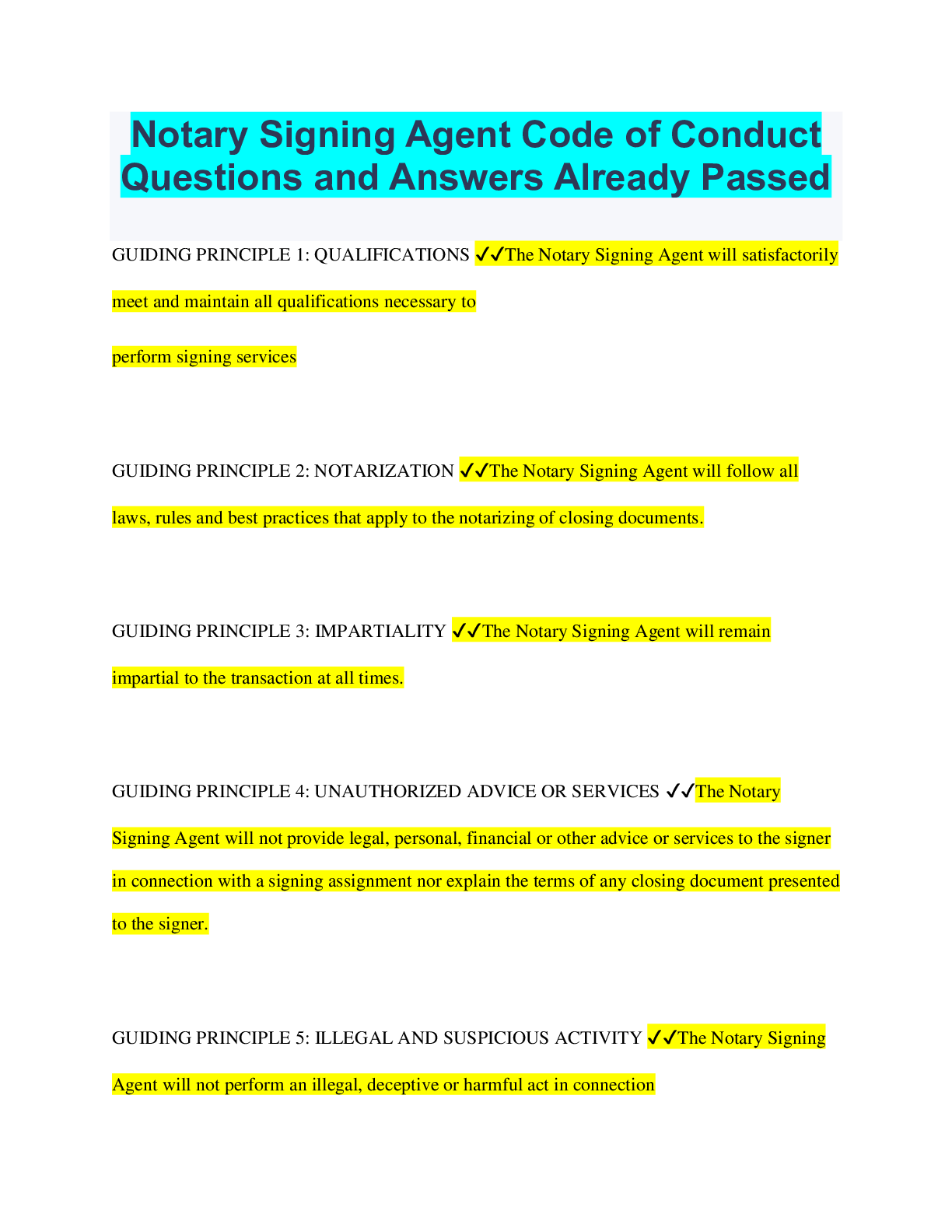 Law > QUESTIONS & ANSWERS > Notary Signing Agent Code of Conduct Questions and Answers Already Passed (All)
