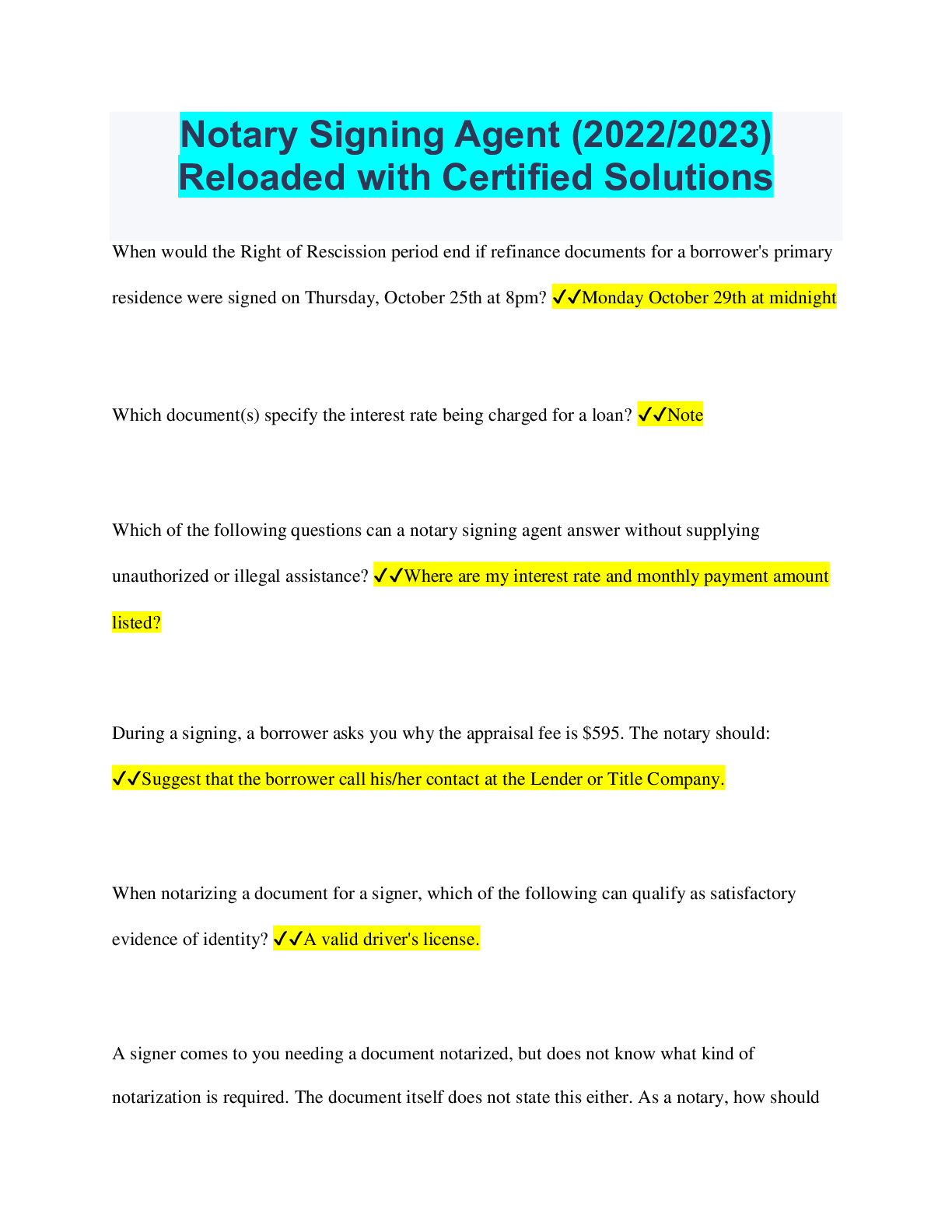 Law > QUESTIONS & ANSWERS > Notary Signing Agent (2022/2023) Reloaded with Certified Solutions (All)
