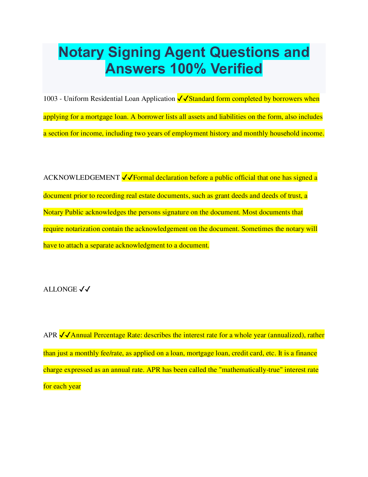 Law > QUESTIONS & ANSWERS > Notary Signing Agent Questions and Answers 100% Verified (All)