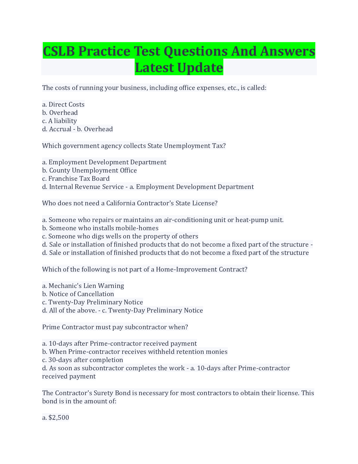 Law > EXAM > CSLB Practice Test Questions And Answers Latest Update (All)
