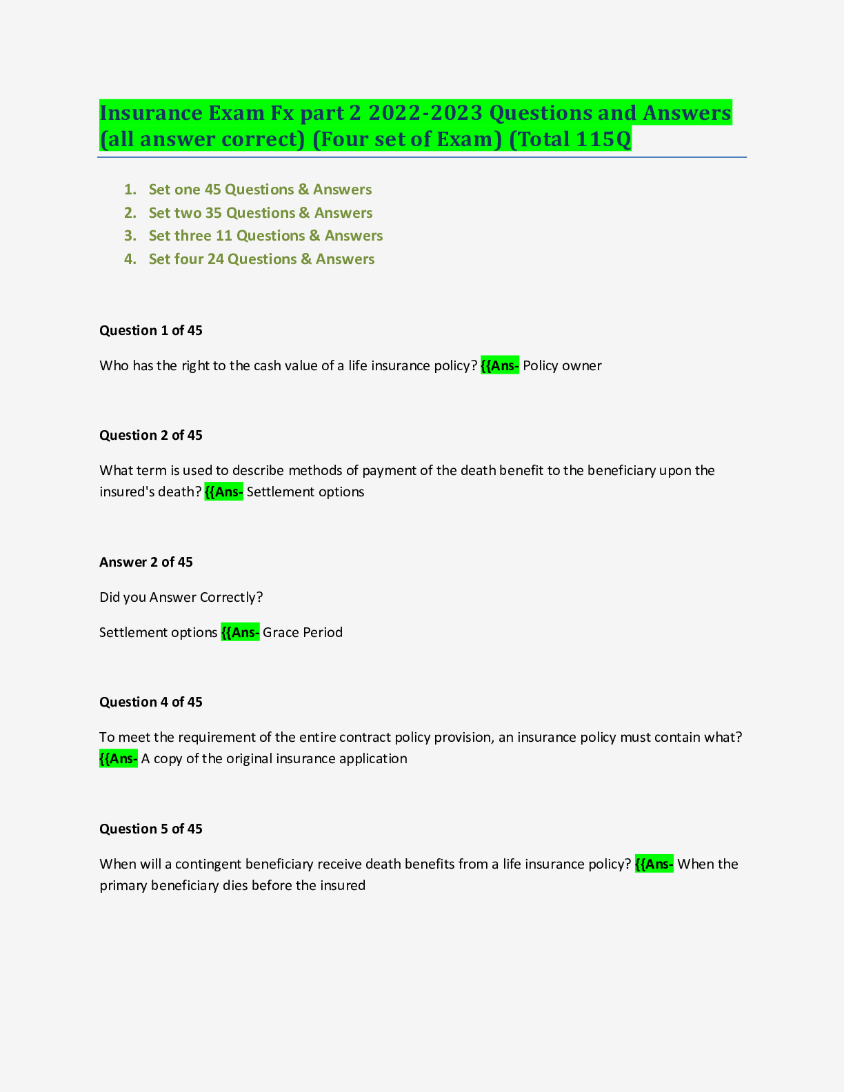Law > EXAM > Insurance Exam Fx part 2 2022-2023 Questions and Answers (all answer correct) (Four set of Exam) (Total 115Q (All)