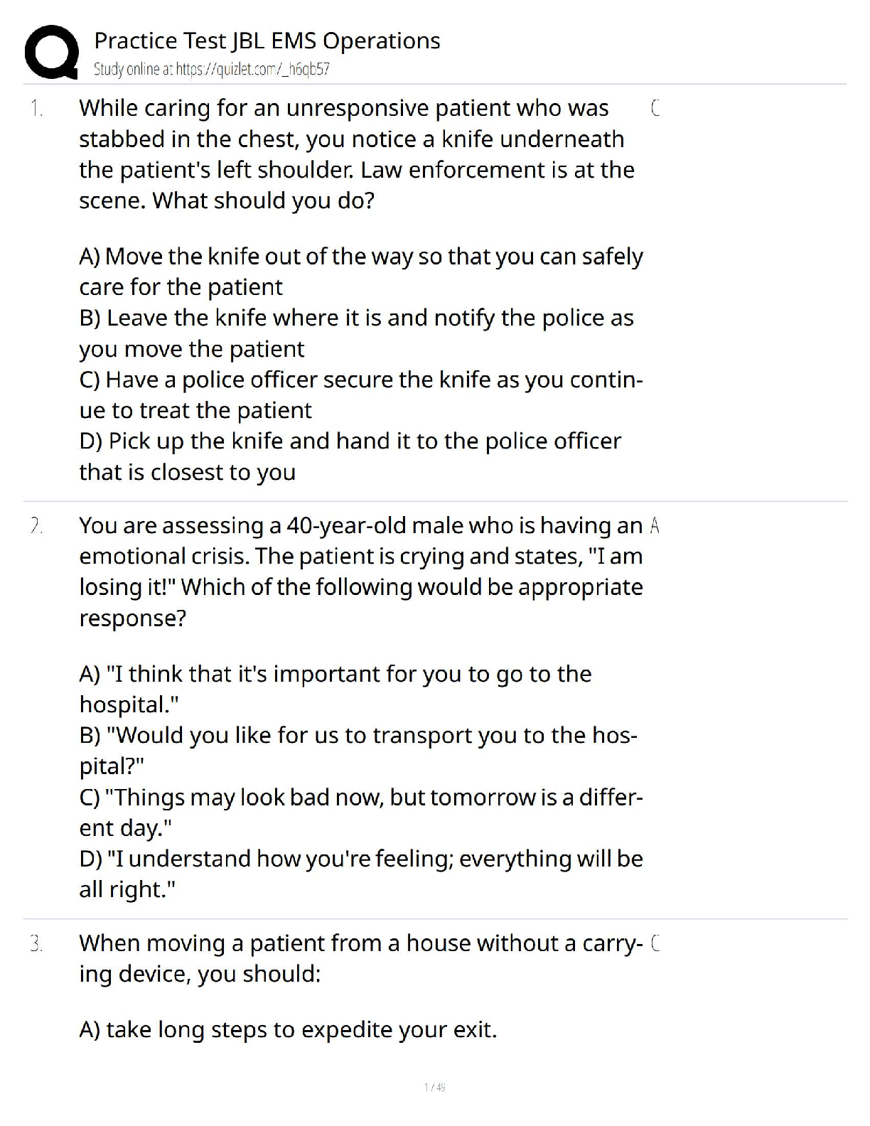 Emergency Preparedness & Management > EXAM > Practice Test JBL EMS Operations emergency medical services practice questions (All)