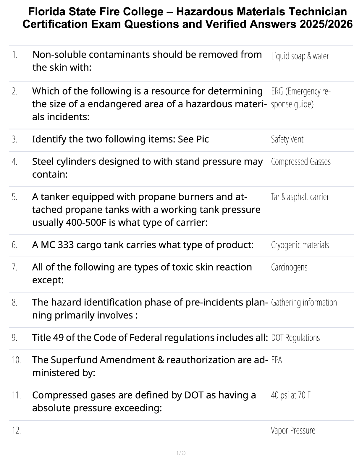 Emergency Preparedness & Management > STUDY GUIDE > Florida State Fire College – Hazardous Materials Technician Certification Exam Questions and Verified Answers 2025/2026 (All)