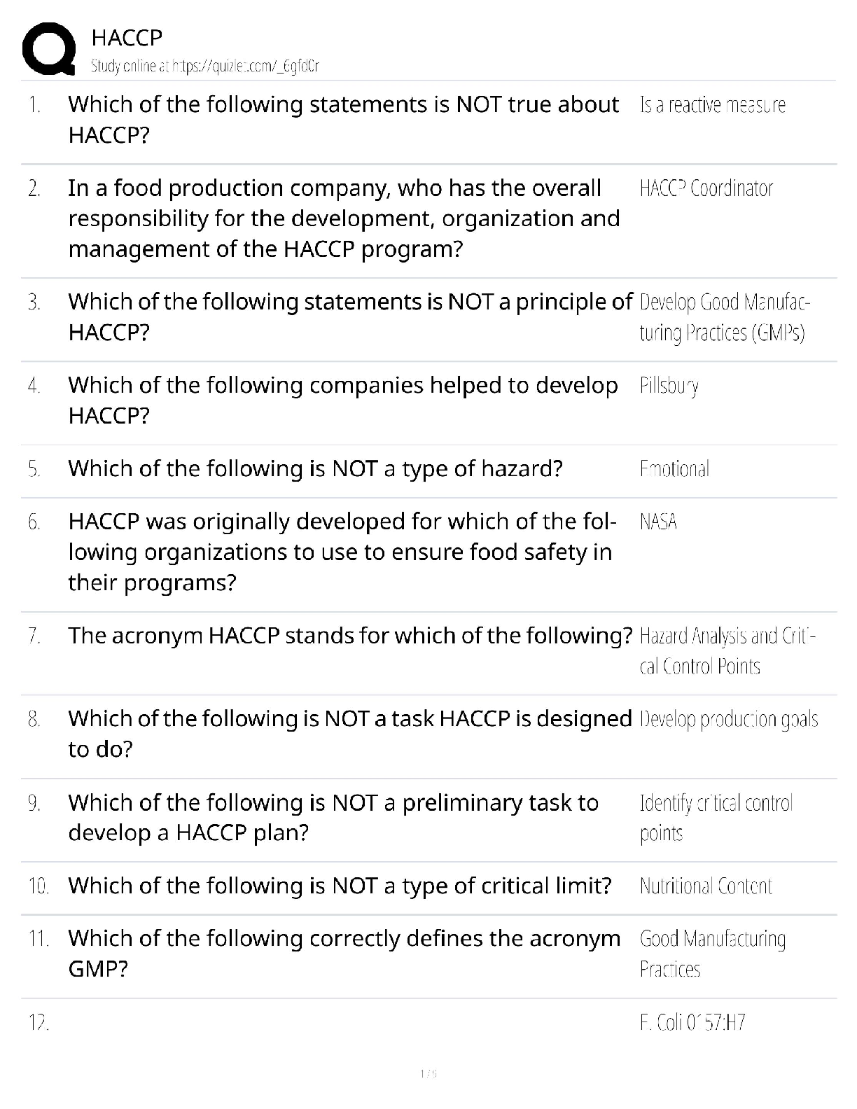 Safety Management > QUESTIONS & ANSWERS > HACCP Certification Exam / Hazard Analysis Critical Control Point / 2026 Update / Practice Test & Study Guide (All)