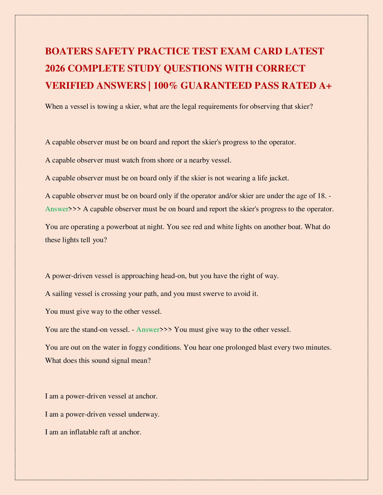 Safety Management > EXAM > BOATERS SAFETY PRACTICE TEST EXAM CARD LATEST 2026 COMPLETE STUDY QUESTIONS WITH CORRECT VERIFIED ANSWERS | 100% GUARANTEED PASS RATED A+ (All)