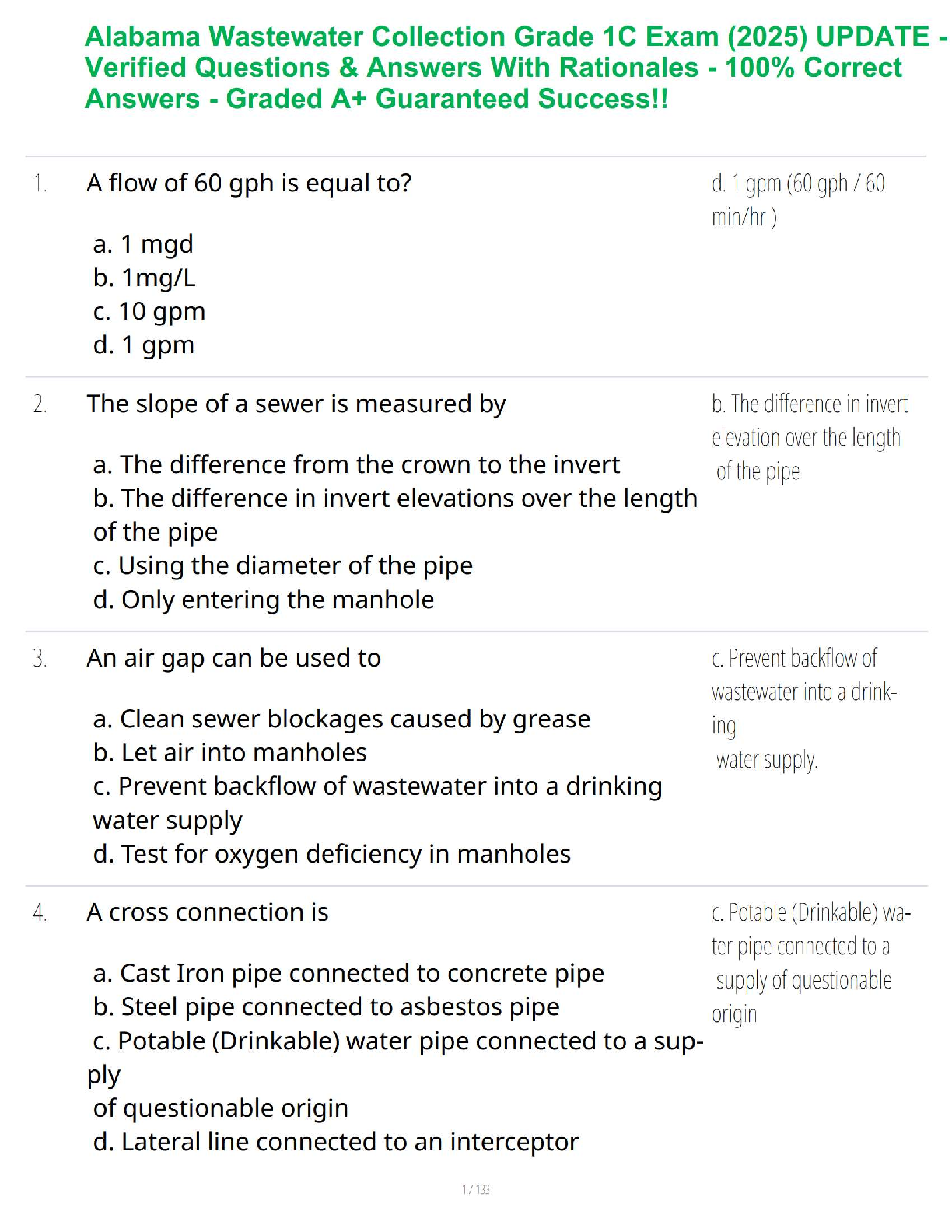 Safety Management > QUESTIONS & ANSWERS > Alabama Wastewater Collection Grade 1C Exam (2025) UPDATE - Verified Questions & Answers - With 100% Correct Answers - Graded A+ Guaranteed Success!! (All)