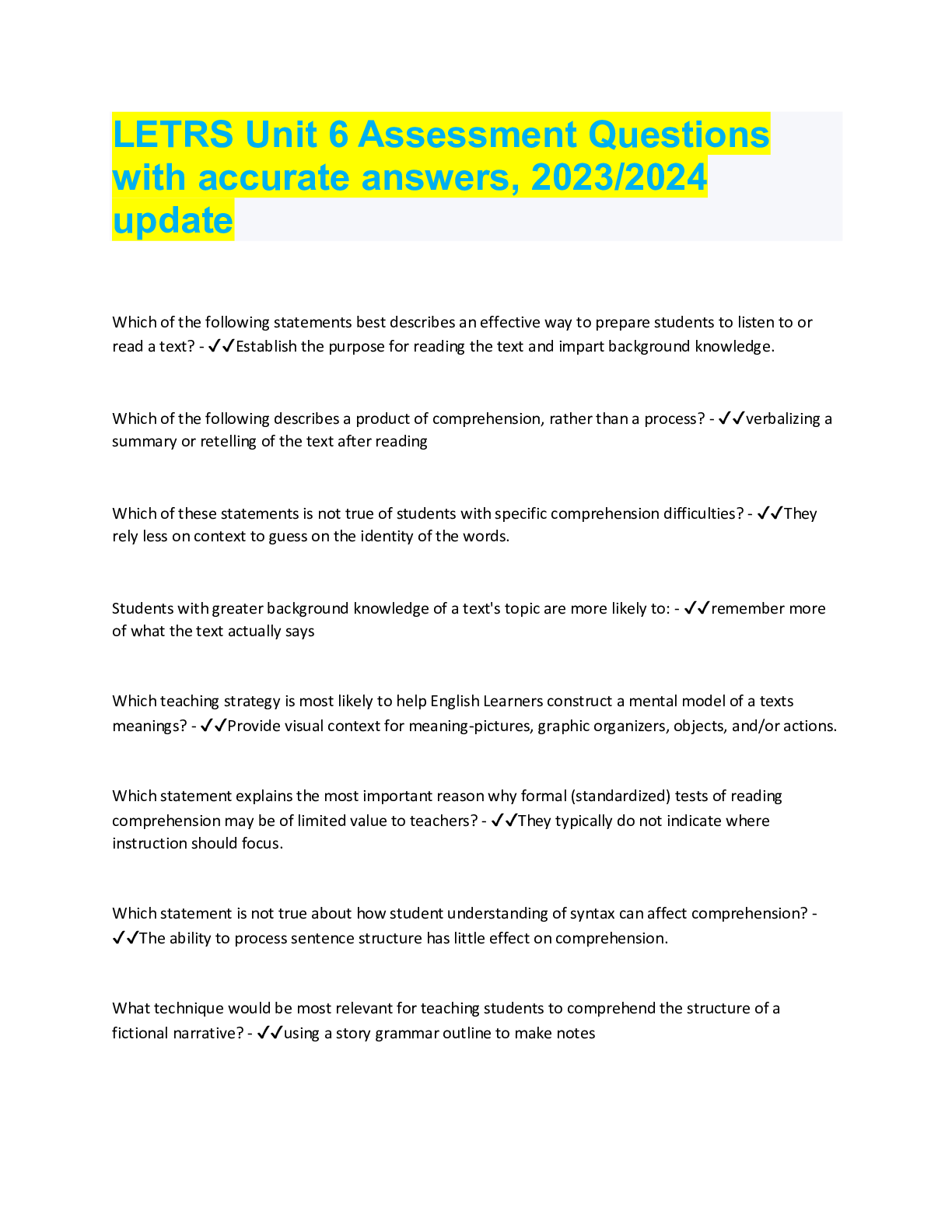 Linguistics > QUESTIONS & ANSWERS > LETRS Unit 6 Assessment Questions with accurate answers, 2023/2024 update (All)