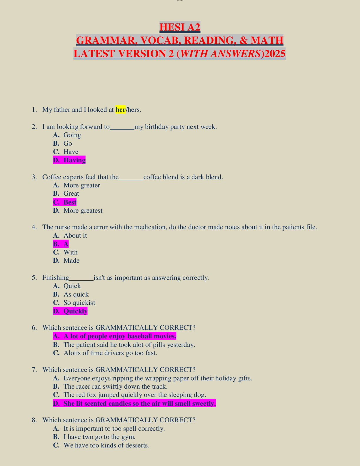 Linguistics > EXAM > HESI A2 GRAMMAR, VOCAB, READING, & MATH LATEST VERSION 2 (WITH ANSWERS)2025 (All)